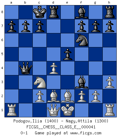 Last move : 0-1 2007 June 9 18:49:44 [Event "FICGS__CHESS__CLASS_E__000041"] [Site "FICGS"] [Date "2007.03.26"] [Round "1"] [White "Podogov,Ilia"] [Black "Nagy,Attila"] [Result "0-1"] [WhiteElo "1400"] [BlackElo "1300"] 1.e4 d5 2.exd5 Qxd5 3.Nc3 Qa5 4.d4 Nf6 5.Nf3 Bg4 6.h3 Bh5 7.Be2 Nc6 8.a3 O-O-O 9.Be3 e5 10.b4 Nxb4 11.axb4 Qxb4 12.Bd2 Bxf3 0-1 Scandinavian defense, Lasker variation Queenside Castling by player Black (move 8) Player Black won this chess game. Follow this game move after move (download)After a bad opening, there is hope for the middle game. After a bad middle game, there is hope for the endgame. But once you are in the endgame, the moment of truth has arrived. (Edmar Mednis) Bogoljubow: Matt in vier Zügen! Tartakower: Ich verbitte mir jede Belästigung! (Savielly Grigorievitsch Tartakower) Un jugador que trata de regresar una movida en el Ajedrez es un futuro carterista. (Richard Fenton) Votre seul travail dans les ouvertures est d'obtenir un milieu de partie jouable. (Lajos Portish) A cynic is a man who knows the price of everything but the value of nothing. (Oscar Wilde)