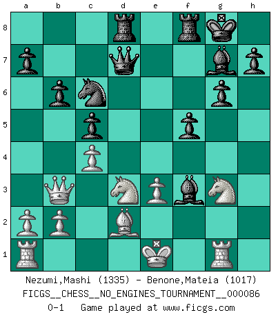 Last move : 0-1 2017 January 17 12:9:57 [Event "FICGS__CHESS__NO_ENGINES_TOURNAMENT__000086"] [Site "FICGS"] [Date "2016.08.14"] [Round "1"] [White "Nezumi,Mashi"] [Black "Benone,Mateia"] [Result "0-1"] [WhiteElo "1335"] [BlackElo "1017"] 1.g4 d5 2.e3 c6 3.d4 Nf6 4.g5 Ne4 5.Bg2 Nxg5 6.Qd3 g6 7.c4 Bf5 8.Qb3 Qd7 9.h3 Bg7 10.Bd2 O-O 11.h4 Ne4 12.Bxe4 dxe4 13.Ne2 Bg4 14.Nbc3 Bf3 15.Rg1 b6 16.h5 Bxh5 17.Nxe4 e5 18.N2g3 Bg4 19.Nh1 exd4 20.Bb4 c5 21.Bd2 f5 22.Neg3 dxe3 23.fxe3 Nc6 24.Nf2 Bf3 25.Nd3 Rad8 0-1 Grob's attack Kingside Castling by player Black (move 10) Player Black won this chess game. Follow this game move after move (download)Chess books should be used as we use glasses: to assist the sight, although some players make use of them as if they thought they conferred sight. (Jose Raul Capablanca) Wie bekannt hörte Morphy 1859 auf, Schach zu spielen. Seine Enttäuschung galt nicht so sehr dem Schach, wie den Schachspielern. (Robert James Fischer) ¿Porque tengo que perder ante este idiota?. (Aron Nimzovich) La vérité est comme le meilleur coup aux échecs : elle existe, mais il faut la chercher. (Arturo Perez-Reverte) All men can see these tactics whereby I conquer, but what none can see is the strategy out of which victory is evolved. (Sun Tzu)