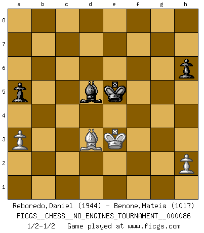 Last move : 1/2-1/2 2016 December 20 15:17:32 [Event "FICGS__CHESS__NO_ENGINES_TOURNAMENT__000086"] [Site "FICGS"] [Date "2016.08.14"] [Round "1"] [White "Reboredo,Daniel"] [Black "Benone,Mateia"] [Result "1/2-1/2"] [WhiteElo "1944"] [BlackElo "1017"] 1.e4 c5 2.Nf3 g6 3.c4 Nc6 4.d4 cxd4 5.Nxd4 Nf6 6.Nc3 Bg7 7.Be3 d6 8.Be2 O-O 9.O-O Bd7 10.Qd2 Qa5 11.Nb3 Qd8 12.f3 a6 13.Rac1 Be6 14.Nd4 Nxd4 15.Bxd4 Rc8 16.Nd5 Nxd5 17.cxd5 Bxd4+ 18.Qxd4 Bd7 19.Qb4 b5 20.Qd4 Qa5 21.a3 Rxc1 22.Rxc1 Rc8 23.Rxc8+ Bxc8 24.Kf2 Qc7 25.Qc3 Qxc3 26.bxc3 e6 27.dxe6 fxe6 28.c4 bxc4 29.Bxc4 g5 30.Ke3 Kg7 31.Kd4 Kf6 32.g3 a5 33.Bb5 Bb7 34.f4 e5+ 35.Ke3 gxf4+ 36.gxf4 d5 37.exd5 Bxd5 38.fxe5+ Kxe5 39.Bd3 h6 1/2-1/2 Sicilian : Hungarian variation Kingside Castling by player Black (move 8) Kingside Castling by player White (move 9) 10 pieces endgame at move 37 : White KBPPP , Black KBPPP WHITE : King + 1 Bishop 3 Pawns BLACK : King + 1 Bishop 3 Pawns 9 pieces endgame at move 38 : White KBPPP , Black KBPP WHITE : King + 1 Bishop 3 Pawns BLACK : King + 1 Bishop 2 Pawns 8 pieces endgame at move 38 : White KBPP , Black KBPP WHITE : King + 1 Bishop 2 Pawns BLACK : King + 1 Bishop 2 Pawns This chess game ended in a draw. Follow this game move after move (download)Daring ideas are like Chess men moved forward. They may be beaten, but they may start a winning game. (Johann Wolfgang von Goethe) Die Auseinandersetzung mit Karpow war politisch geprägt. Er stand für das kommunistische System, wurde von dessen Repräsentanten gehätschelt. Ich war der Oppositionelle. Jeder Schachweltmeister spiegelt auch die gesellschaftlichen Verhältnisse wider. Kramnik steht für die Börsen-Generation des Neuen Markts, ideologiefrei, zahlenfixiert. (Garry Kasparov) La vida es como un juego de Ajedrez, cambiando con cada movimiento. (Proverbio Chino) Soyez une menace à chaque fois que vous vous asseyez pour jouer. (Ken Smith) As a goal marker shodan is important. As a destination it is a poor place to stop. (Thomas Tamayo)