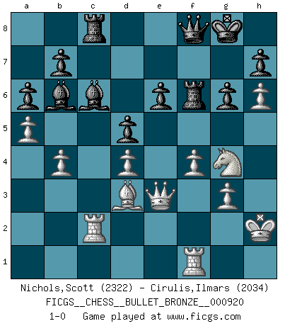 Last move : 1-0 2016 August 18 15:43:52 [Event "FICGS__CHESS__BULLET_BRONZE__000920"] [Site "FICGS"] [Date "2016.08.18"] [Round "1"] [White "Nichols,Scott"] [Black "Cirulis,Ilmars"] [Result "1-0"] [WhiteElo "2322"] [BlackElo "2034"] 1.e4 a6 2.d4 e6 3.Nf3 d5 4.Nbd2 Ne7 5.c3 Nd7 6.Bd3 Ng6 7.Bc2 Be7 8.e5 c5 9.h4 cxd4 10.cxd4 O-O 11.h5 Nh4 12.Nxh4 Bxh4 13.Nf3 Be7 14.O-O f5 15.exf6 Nxf6 16.Ne5 Bd7 17.Re1 Rc8 18.h6 g6 19.Bd2 Bd6 20.Bg5 Qe8 21.Rc1 Bb5 22.a4 Bc6 23.Qe2 Bb4 24.Rf1 Bd6 25.Qe3 Nd7 26.Ng4 Bb4 27.b3 Ba5 28.Bd3 Rf7 29.f4 Bb4 30.g3 Qf8 31.Kh2 Ba5 32.Rc2 Bb6 33.b4 Nf6 34.Bxf6 Rxf6 35.a5 1-0 St. George (Baker) defense Kingside Castling by player Black (move 10) Kingside Castling by player White (move 14) Player White won this chess game. Follow this game move after move (download)The hardest game to win is a won game. (Emanuel Lasker) Mein Gehirn das ist mein zweitwichtigstes Organ [Aus dem Film: Der Schläfer]. (Woody Allen) Cada Peón es potencialmente una Reina. (James Mason) Les échecs sont un jeu terrible. Si vous n'avez pas le centre, votre adversaire a une position plus libre. Par contre, si vous avez le centre, alors vous avez vraiment quelque chose pour laquelle vous inquiéter ! (Siegbert Tarrasch) A married woman is like a fish riding a bicycle. (Rodolfo d'Ettorre)