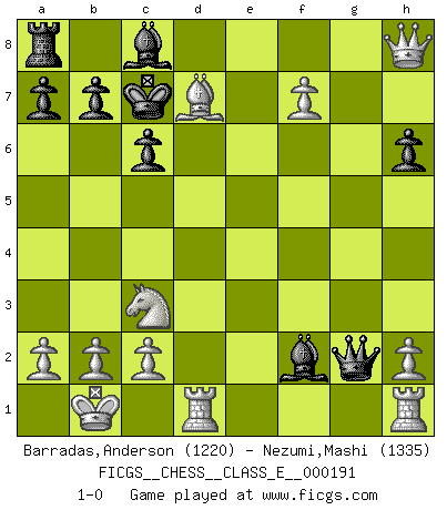 Last move : 1-0 2016 October 3 14:51:24 [Event "FICGS__CHESS__CLASS_E__000191"] [Site "FICGS"] [Date "2016.08.24"] [Round "1"] [White "Barradas,Anderson"] [Black "Nezumi,Mashi"] [Result "1-0"] [WhiteElo "1220"] [BlackElo "1335"] 1.e4 d6 2.d4 c6 3.Nf3 h6 4.Nc3 Nf6 5.Be2 Nbd7 6.e5 dxe5 7.dxe5 Ng4 8.Qd4 Qc7 9.Bf4 f6 10.exf6 e5 11.f7+ Kd8 12.Nxe5 Ngxe5 13.Bxe5 Qxe5 14.O-O-O Qg5+ 15.Kb1 Qxg2 16.Bg4 Bc5 17.Qxg7 Bxf2 18.Qxh8+ Kc7 19.Bxd7 1-0 King's pawn Opening Queenside Castling by player White (move 14) Player White won this chess game. Follow this game move after move (download)The isolated Pawn casts gloom over the entire chessboard. (Aaron Nimzovich) Das Schachspiel ist ein See, in welchem eine Mücke baden und ein Elefant ertrinken kann. (Emanuel Lasker) Bobby Fischer es el jugador de Ajedrez mas grande que jamás haya existido. (Ken Smith) C'est une question de caractère, Beaucoup de gens perdent leur motivation très vite. D'autres, ils sont rares, peuvent la conserver très longtemps. J'aime les échecs, encore aujourd'hui je suis heureux d'analyser des parties. J'aime toujours gagner, je déteste encore perdre. Bien jouer est important pour mon intégrité intellectuelle et morale. Et puis les échecs vivent en ce moment une période historique grâce à Internet. Ils se développent dans les systèmes éducatifs à travers le monde. Ils sortent de leur ghetto, et c'est mon rôle de mener à bien cette révolution. (Gary Kasparov) A good player is always lucky. (Capablanca)