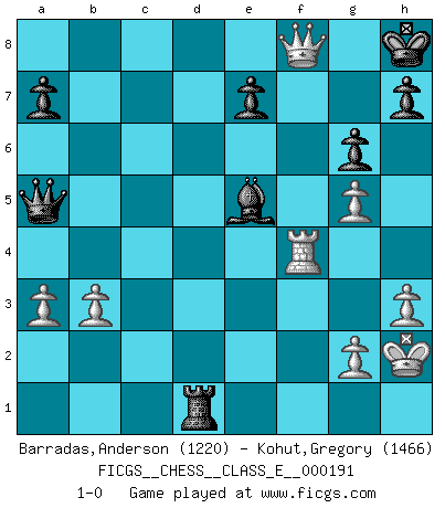 Last move : 1-0 2017 February 3 2:43:6 [Event "FICGS__CHESS__CLASS_E__000191"] [Site "FICGS"] [Date "2016.08.24"] [Round "1"] [White "Barradas,Anderson"] [Black "Kohut,Gregory"] [Result "1-0"] [WhiteElo "1220"] [BlackElo "1466"] 1.e4 c5 2.Nf3 Nc6 3.d4 cxd4 4.Nxd4 g6 5.Nc3 Bg7 6.Nxc6 bxc6 7.Bd2 Rb8 8.b3 Nf6 9.Bd3 d5 10.O-O O-O 11.Rb1 Bg4 12.f3 dxe4 13.fxg4 exd3 14.g5 dxc2 15.Qxc2 Nd5 16.Rbd1 Qb6+ 17.Kh1 Bxc3 18.Bf4 Nxf4 19.Rxf4 Rbd8 20.Rxd8 Rxd8 21.h3 Bg7 22.a3 Qa5 23.Qc4 Rd5 24.Qxc6 Rd1+ 25.Kh2 Be5 26.Qe8+ Kg7 27.Qxf7+ Kh8 28.Qf8+ 1-0 Sicilian : Accelerated Fianchetto, Modern variation Kingside Castling by player White (move 10) Kingside Castling by player Black (move 10) Player White won this chess game. Follow this game move after move (download)Fischer sacrificed virtually everything most of us weakies (to use his term) value, respect, and cherish, for the sake of an artful, often beautiful board game, for the ambivalent privilege of being its greatest master. (Paul Kollar) Ich las kürzlich ein Buch von Nietzsche. Er sagte Religion verdumme nur die Menschen. Ich stimme zu. (Robert James Fischer) El Ajedrez es la vida. (Bobby Fischer) Tous ces prétendus hommes politiques sont les pions, les Cavaliers, les Tours ou les Fous d'une partie d'échecs qui se jouera tant qu'un hasard ne renversera pas l'échiquier. (Honoré de Balzac) He who defends everything defends nothing. (Frederick the Great)