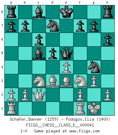 Last move : 1-0 2007 June 24 8:41:17 [Event "FICGS__CHESS__CLASS_E__000041"] [Site "FICGS"] [Date "2007.03.26"] [Round "1"] [White "Schafer,Banner"] [Black "Podogov,Ilia"] [Result "1-0"] [WhiteElo "1259"] [BlackElo "1400"] 1.d4 d5 2.c4 e6 3.e3 Nf6 4.c5 Nbd7 5.Nc3 c6 6.Nf3 Be7 7.Bd3 h6 8.O-O Qc7 9.Qc2 e5 10.e4 exd4 11.Nxd4 Bxc5 12.Be3 Ng4 13.g3 Qe5 14.Nf3 1-0 This chess game has been lost on time (started : 2007.03.26 21:46:55) Queen's gambit declined Kingside Castling by player White (move 8) Player White won this chess game. Follow this game move after move (download)Checkers is for tramps. (Paul Morphy) Ich habe die Schachforschung dermaßen betrieben, dass sie auf eine wissenschaftliche Basis gestellt wurde. (Mikhail Moiseyevich Botvinik) El Ajedrez es un cuento de Hadas de las 1001 metidas de pata. (Savielly Tartakower) La solitude du joueur d'Echecs à l'approche du mat est semblable à celle du condamné. (Francis Szpiner) Whatever you do, don't be bored. This is absolutely the most exciting time we could have possibly hoped to be alive. And things are just starting. (From movie Waking life)