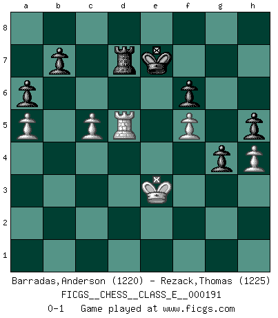 Last move : 0-1 2016 October 22 16:50:40 [Event "FICGS__CHESS__CLASS_E__000191"] [Site "FICGS"] [Date "2016.08.24"] [Round "1"] [White "Barradas,Anderson"] [Black "Rezack,Thomas"] [Result "0-1"] [WhiteElo "1220"] [BlackElo "1225"] 1.e4 c5 2.Nf3 d6 3.d4 cxd4 4.Nxd4 Nf6 5.Nc3 Nc6 6.Bb5 Bd7 7.O-O e6 8.Bg5 Be7 9.Nf3 a6 10.Bxc6 Bxc6 11.Re1 O-O 12.Qd3 Qc7 13.Qc4 Rac8 14.a4 Rfe8 15.Re3 d5 16.exd5 Nxd5 17.Nxd5 Bxd5 18.Qd3 Qxc2 19.Qxc2 Rxc2 20.Rc3 Rxc3 21.bxc3 Bxf3 22.Bxe7 Rxe7 23.gxf3 Rc7 24.Ra3 Rc4 25.Kf1 Kf8 26.Ke2 Ke7 27.a5 Kd6 28.Kd3 Kd5 29.Rb3 Rc7 30.h4 f6 31.Rb4 e5 32.f4 exf4 33.Rxf4 Rc5 34.Ra4 Rc7 35.f4 h6 36.Rd4+ Ke6 37.c4 Kf5 38.Ke3 Re7+ 39.Kf3 g5 40.Rd5+ Kg6 41.Kg4 h5+ 42.Kf3 g4+ 43.Kf2 Rc7 44.f5+ Kf7 45.c5 Ke7 46.Ke3 Rd7 0-1 Sicilian Kingside Castling by player White (move 7) Kingside Castling by player Black (move 11) Player Black won this chess game. Follow this game move after move (download)Adequate compensation for a sacrifice is having a sound combination leading to a winning position; adequate compensation for a blunder is having your opponent snatch defeat from the jaws of victory. (Bruce A. Moon) Es liegt in der Natur, vernüftig zu denken und unlogisch zu handeln. (Anatole France) La esencia del Ajedrez es pensar acerca de lo que el Ajedrez es. (David Bronstein) Les pièces de l'échiquier étaient impitoyables. Elles le retenaient, elles l'absorbaient. Il y avait de l'horreur en cela, mais aussi une harmonie unique. Car, qu'y a-t-il dans le monde, à part les échecs ? (V. Nabokov) There is no instance of a country having benefited from prolonged warfare. (Sun Tzu)