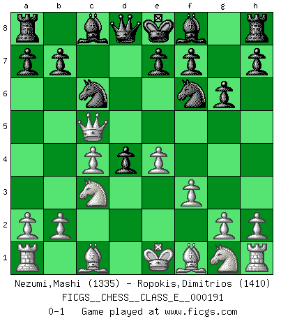 Last move : 0-1 2016 October 11 12:11:24 [Event "FICGS__CHESS__CLASS_E__000191"] [Site "FICGS"] [Date "2016.08.24"] [Round "1"] [White "Nezumi,Mashi"] [Black "Ropokis,Dimitrios"] [Result "0-1"] [WhiteElo "1335"] [BlackElo "1410"] 1.c4 g6 2.d4 Nf6 3.Nc3 d5 4.f3 c5 5.e4 cxd4 6.Qxd4 Nc6 7.Qc5 d4 0-1 This chess game has been lost on time (started : 2016.08.24 1:50:38) English Opening Player Black won this chess game. Follow this game move after move (download)I won't play with you anymore. You have insulted my friend. - When an opponent cursed himself for a blunder. (Miguel Najdorf) Schach ist ein Teil der Kultur, und wenn es mit der Kultur abwärts geht, geht es auch mit dem Schach abwärts. (Mikhail Moiseyevich Botvinik) Aún el Rey más flojo huye despavorido ante la amenaza de un Jaque doble. (Aaron Nimzowitsch) Il s'avisa de me proposer d'apprendre les échecs qu'il jouait un peu... me voilà forcené des échecs. J'achète un échiquier, je m'enferme dans ma chambre, j'y passe des jours et des nuits à vouloir apprendre par cur toutes les parties. (Jean-Jacques Rousseau, Confessions) The meaning of life is that it is to be lived, and it is not to be traded and conceptualized and squeezed into a pattern of systems. (Bruce Lee)