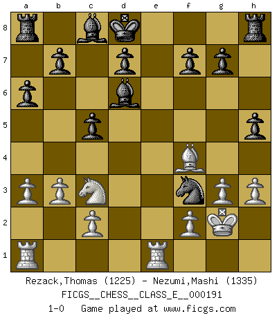 Last move : 1-0 2016 December 6 7:43:43 [Event "FICGS__CHESS__CLASS_E__000191"] [Site "FICGS"] [Date "2016.08.24"] [Round "1"] [White "Rezack,Thomas"] [Black "Nezumi,Mashi"] [Result "1-0"] [WhiteElo "1225"] [BlackElo "1335"] 1.e4 e5 2.Nf3 Nc6 3.d4 exd4 4.Nxd4 Nxd4 5.Qxd4 Nf6 6.Bc4 c5 7.Qd1 a6 8.a3 Nxe4 9.Qe2 Qe7 10.O-O Nd6 11.Qxe7+ Kxe7 12.Bf4 Nxc4 13.Re1+ Kd8 14.b3 Bd6 15.Bc1 Ne5 16.Nc3 Ng4 17.g3 h5 18.h3 Ne5 19.Bf4 Nf3+ 20.Kg2 1-0 This chess game has been lost on time (started : 2016.08.24 1:50:38) Scotch game Kingside Castling by player White (move 10) Player White won this chess game. Follow this game move after move (download)A Chess game is divided into three stages: the first, when you hope you have the advantage, the second when you believe you have an advantage, and the third... when you know you're going to lose ! (Savielly Tartakower) Ich verachte die Medien. (Robert James Fischer) Una partida de Ajedrez se divide en 3 etapas: la primera cuando piensas que tienes la ventaja, la segunda cuando crees que tienes la ventaja y la tercera... ¡cuando te das cuenta que vas a perder!. (Savielly Tartakower) La tactique, c'est ce que vous faites quand il y a quelque chose à faire; la stratégie, c'est ce que vous faites quand il n'y a rien à faire. (Savielli Tartacower) At last I discovered the true beauty of chess. So I proposed to her. (Dinesh De Silva)