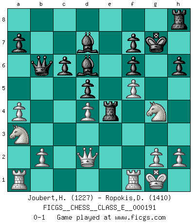 Last move : 0-1 2016 September 2 11:42:2 [Event "FICGS__CHESS__CLASS_E__000191"] [Site "FICGS"] [Date "2016.08.24"] [Round "1"] [White "Joubert,Hennie"] [Black "Ropokis,Dimitrios"] [Result "0-1"] [WhiteElo "1227"] [BlackElo "1410"] 1.e4 e5 2.Nf3 Nf6 3.Nxe5 d6 4.Nf3 Nxe4 5.c3 d5 6.d4 Bd6 7.Bd3 O-O 8.O-O Nf6 9.Bg5 Be6 10.Ne5 c5 11.f4 h6 12.Bh4 Nc6 13.Bb5 Qb6 14.Bxc6 bxc6 15.Bxf6 gxf6 16.Ng4 Kg7 17.f5 Bd7 18.Qd2 Rh8 19.a4 Rae8 20.Na3 cxd4 21.cxd4 Re4 0-1 Petrov's defense Kingside Castling by player Black (move 7) Kingside Castling by player White (move 8) Player Black won this chess game. Follow this game move after move (download)Personally, I rather look forward to a computer program winning the world Chess Championship. Humanity needs a lesson in humility. (Richard Dawkings) Jeder Fehler erscheint unglaublich dumm, wenn andre ihn begehen. (Georg Christoph Lichtenberg) Si un gobernante no entiende al Ajedrez, ¿como puede governar él un reinado?. (El Rey Khusros II) Les Cavaliers se révèlent fort utiles dans les positions fermées. D'habitude, les Fous sont un peu plus forts que les Cavaliers dans les positions ouvertes. Qu'on le veuille ou non, il restera toujours des exceptions ! You lose, general Kenobi. (General Grievous in Star Wars ep.3)