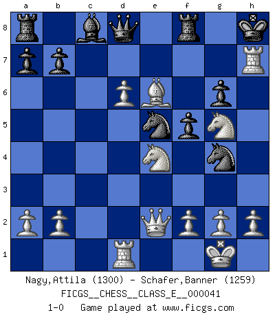Last move : 1-0 2007 April 28 21:45:36 [Event "FICGS__CHESS__CLASS_E__000041"] [Site "FICGS"] [Date "2007.03.26"] [Round "1"] [White "Nagy,Attila"] [Black "Schafer,Banner"] [Result "1-0"] [WhiteElo "1300"] [BlackElo "1259"] 1.e4 c5 2.d4 cxd4 3.c3 dxc3 4.Nxc3 Nc6 5.Nf3 g6 6.Bc4 Bg7 7.O-O Nf6 8.Qe2 O-O 9.Rd1 d6 10.e5 Ng4 11.exd6 e6 12.Bg5 Bf6 13.Ne4 Bxg5 14.Nfxg5 Nce5 15.Rac1 f5 16.Bxe6+ Kg7 17.Rc7+ Kh8 18.Rxh7+ 1-0 Sicilian : Smith-Morra gambit Kingside Castling by player White (move 7) Kingside Castling by player Black (move 8) Player White won this chess game. Follow this game move after move (download)The most important feature of the Chess position is the activity of the pieces. This is absolutely fundamental in all phases of the game: Opening, Middlegame and especially Endgame. The primary constraint on a piece's activity is the Pawn structure. (Michael Stean) Die Idee von Capablanca, Schach als Fach in den Schulen zu lehren, ist großartig. (Fidel Castro) Debemos de asegurarnos de que el Ajedrez no se convierta en un lenguaje muerto, muy interesante, pero solo para un grupo muy pequeño. (Sytze Faber) Ce qui est bien, c'est d'avoir tout un tas de pièces en prise : l'adversaire ne peut en prendre qu'une à la fois. Cité par Thierry Audin. After growing wildly for years, the field of computing appears to be reaching its infancy. (John Pierce)