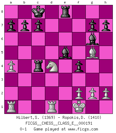 Last move : 0-1 2016 September 13 22:55:7 [Event "FICGS__CHESS__CLASS_E__000191"] [Site "FICGS"] [Date "2016.08.24"] [Round "1"] [White "Hilbert,Stephan J."] [Black "Ropokis,Dimitrios"] [Result "0-1"] [WhiteElo "1369"] [BlackElo "1410"] 1.e4 e5 2.d4 exd4 3.c3 Qe7 4.Bd3 d5 5.Qe2 dxe4 6.Qxe4 dxc3 7.Nxc3 Bf5 8.Qxe7+ Nxe7 9.Ne4 Nbc6 10.Ne2 O-O-O 11.Bc2 Nb4 12.Bb1 Nd3+ 13.Bxd3 Rxd3 14.N2g3 Bg6 15.O-O Nd5 16.Bg5 f5 17.Nc3 Nxc3 18.bxc3 Rxc3 19.Ne2 Rc4 20.a4 Bd6 21.Rfd1 Re8 22.Kf1 f4 23.Nd4 Be5 0-1 Danish gambit Queenside Castling by player Black (move 10) Kingside Castling by player White (move 15) Player Black won this chess game. Follow this game move after move (download)Chess is a cold bath for the mind. (Sir John Simon) Die unerbitterlichsten Regeln im Schach sind die Ausnahmen. (Savielly Grigorievitsch Tartakower) La maestría del Ajedrez consiste esencialmente en analizar posiciónes de Ajedrez con precisión. (Mikhail Botvinnik) Même si l'adversaire joue le coup analysé précédemment, recommencez l'analyse en voyant la nouvelle position. Première règle de Blumenfeld There are three kinds of lies: lies, damned lies and statistics. (Mark Twain)