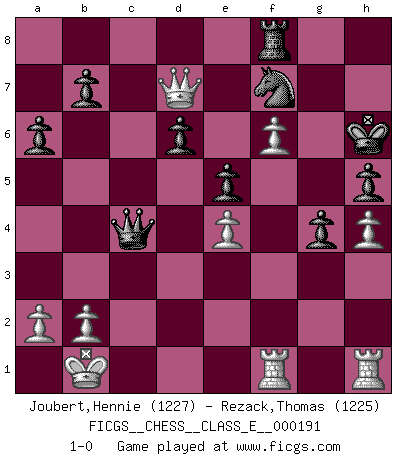 Last move : 1-0 2016 October 10 12:3:35 [Event "FICGS__CHESS__CLASS_E__000191"] [Site "FICGS"] [Date "2016.08.24"] [Round "1"] [White "Joubert,Hennie"] [Black "Rezack,Thomas"] [Result "1-0"] [WhiteElo "1227"] [BlackElo "1225"] 1.e4 c5 2.Nf3 d6 3.d4 cxd4 4.Nxd4 Nf6 5.Nc3 Nc6 6.Be3 Bd7 7.Be2 e6 8.Qd2 Be7 9.g4 a6 10.g5 Ng8 11.f4 Qc7 12.h4 f6 13.Bg4 e5 14.Bxd7+ Qxd7 15.Nd5 Rb8 16.f5 Nxd4 17.Bxd4 fxg5 18.Bf2 g4 19.O-O-O Nh6 20.Kb1 Nf7 21.Bb6 Bd8 22.Bxd8 Rxd8 23.Qc3 O-O 24.Rdf1 h5 25.f6 g6 26.Ne7+ Kh7 27.Qe1 Qb5 28.Qf2 Rd7 29.c4 Qxc4 30.Nxg6 Kxg6 31.Qf5+ Kh6 32.Qxd7 1-0 Sicilian Queenside Castling by player White (move 19) Kingside Castling by player Black (move 23) Player White won this chess game. Follow this game move after move (download)Combinations have always been the most intriguing aspect of Chess. The masters look for them, the public applauds them, the critics praise them. It is because combinations are possible that Chess is more than a lifeless mathematical exercise. They are the poetry of the game; they are to Chess what melody is to music. They represent the triumph of mind over matter. (Reuben Fine) Oft bringt ein stiller Zug das Erdbeben. (Richard Reti) El Ajedrez por encima de todo... ¡es una pelea!. (Emanuel Lasker) Soyez une menace à chaque fois que vous vous asseyez pour jouer. (Ken Smith) Memory is a way of holding onto the things you love, the things you are, the things you never want to lose. (from the television show: The Wonder Years)