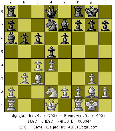 Last move : 1-0 2007 May 10 14:33:9 [Event "FICGS__CHESS__RAPID_B__000044"] [Site "FICGS"] [Date "2007.03.27"] [Round "1"] [White "Wyngaarden,Martin"] [Black "Rundgren,Anders"] [Result "1-0"] [WhiteElo "1700"] [BlackElo "1400"] 1.d4 Nf6 2.c4 e6 3.Nf3 b6 4.g3 Ba6 5.b3 Bb4+ 6.Bd2 Be7 7.Bg2 c6 8.Bc3 d5 9.Ne5 Nfd7 10.Nxd7 Nxd7 11.Nd2 O-O 12.O-O 1-0 This chess game has been lost on time (started : 2007.03.27 5:42:57) Queen's Indian : Nimzovich variation (exaggerated Fianchetto) Kingside Castling by player Black (move 11) Kingside Castling by player White (move 12) Player White won this chess game. Follow this game move after move (download)If one piece is badly posted, the whole game is bad. (Tarrasch) Früher wurde jeder komplizierte Zug, jedes interessante Opfer mit großem Beifall und Enthusiasmus aufgenommen. Heute schaltet man einfach seinen Fritz an, und man kann sehen, was los ist, ob der Zug geht oder nicht. (Vladimir Kramnik) Un entendimiento a fondo de las continuaciones típicas del mate, hace de las combinaciones de sacrificio mas complicadas conducirlas a ellas no solo sin dificultad, sino casi de una manera natural. (Siegbert Tarrasch) C'est la seule position que je connaisse où les deux camps sont mals. Propos prêtés à V. Anand. The production of too many useful things results in too many useless people. (Karl Marx)