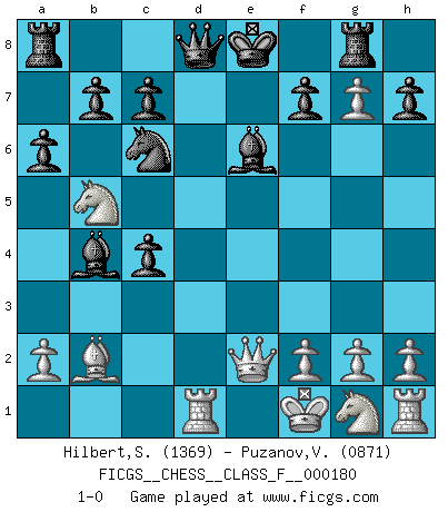 Last move : 1-0 2016 November 25 18:37:14 [Event "FICGS__CHESS__CLASS_F__000180"] [Site "FICGS"] [Date "2016.08.24"] [Round "1"] [White "Hilbert,Stephan J."] [Black "Puzanov,Vasyl"] [Result "1-0"] [WhiteElo "1369"] [BlackElo "0871"] 1.e4 e5 2.d4 exd4 3.c3 dxc3 4.Bc4 cxb2 5.Bxb2 Bb4+ 6.Kf1 Nf6 7.e5 d5 8.exf6 dxc4 9.Qe2+ Be6 10.fxg7 Rg8 11.Nc3 Nc6 12.Nb5 a6 13.Rd1 1-0 This chess game has been lost on time (started : 2016.08.24 1:51:4) Danish gambit Player White won this chess game. Follow this game move after move (download)At this time Fischer is simply a level above all the best Chessplayers in the world. (John Jacobs) Vom Schach wurde gesagt das Leben sei dafür nicht lange genug. Aber das ist der Fehler des Lebens, nicht des Schach'. (Irving Chernev) Aquellos que dicen que entienden al Ajedrez, no entienden nada. (Robert Hubner) Le moment que je préfère le plus dans une rencontre, c'est celui où je sens que la personnalité de l'adversaire se brise. (Robert Fischer) Experiences are the keys to life. (Daniel Parmet)