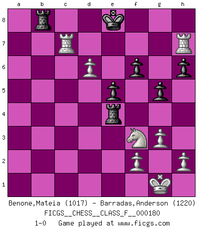 Last move : 1-0 2016 October 10 1:57:13 [Event "FICGS__CHESS__CLASS_F__000180"] [Site "FICGS"] [Date "2016.08.24"] [Round "1"] [White "Benone,Mateia"] [Black "Barradas,Anderson"] [Result "1-0"] [WhiteElo "1017"] [BlackElo "1220"] 1.e4 e5 2.Nf3 Nc6 3.Bc4 Bc5 4.b4 Nxb4 5.c3 Nd3+ 6.Bxd3 Nf6 7.Ba3 Bd6 8.O-O O-O 9.Bc2 b6 10.d4 Re8 11.Bxd6 cxd6 12.d5 Ba6 13.Bd3 b5 14.a4 Qa5 15.Qb3 Rab8 16.Qb4 Qxb4 17.cxb4 Rec8 18.Nbd2 Rc3 19.Be2 Rc2 20.Bd3 Rb2 21.axb5 Bxb5 22.Bxb5 Rxb5 23.Rxa7 Rb8 24.Ra6 Ne8 25.Nc4 R2xb4 26.Nxd6 Nxd6 27.Rxd6 Rxe4 28.Rxd7 f6 29.d6 Kf8 30.g3 h6 31.Rc1 g5 32.R1c7 Ke8 33.Rh7 1-0 Evans gambit declined Kingside Castling by player White (move 8) Kingside Castling by player Black (move 8) Player White won this chess game. Follow this game move after move (download)The game of Chess is not merely an idle amusement; several very valuable qualities of the mind are to be acquired and strengthened by it, so as to become habits ready on all occasions; for life is a kind of Chess. (Benjamin Franklin) Besser ein falscher Plan, logisch durchgeführt, als gar kein Plan. (Viktor Kortschnoi) El Ajedrez por encima de todo... ¡es una pelea!. (Emanuel Lasker) Il (Jacob Murray) ne joue pas pour le bon coup, mais pour le meilleur. (Eloi Relange) Man is reluctant to give credit for intelligence to anyone, except his enemies. (Albert Einstein)