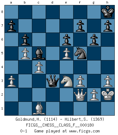 Last move : 0-1 2016 September 18 0:2:18 [Event "FICGS__CHESS__CLASS_F__000180"] [Site "FICGS"] [Date "2016.08.24"] [Round "1"] [White "Goldmund,Heike"] [Black "Hilbert,Stephan J."] [Result "0-1"] [WhiteElo "1114"] [BlackElo "1369"] 1.e4 c5 2.b4 b6 3.a3 e6 4.c4 Bb7 5.d3 d6 6.b5 Nf6 7.Nf3 Be7 8.Bb2 O-O 9.Be2 Nbd7 10.O-O d5 11.Nbd2 dxe4 12.dxe4 Qc7 13.Qc2 Nh5 14.Rfe1 Ndf6 15.e5 Ng4 16.Bd3 g6 17.Ne4 Ng7 18.Rad1 Rad8 19.h3 Nh6 20.Nf6+ Kh8 21.Be4 Nhf5 22.Bxb7 Qxb7 23.Rxd8 Rxd8 24.Rd1 Nd4 25.Nxd4 cxd4 26.Bxd4 Nf5 27.Bb2 Nh4 28.f3 Qc7 29.Kh2 Nf5 30.Rxd8+ Qxd8 31.Ng4 Nd4 32.Qf2 Bc5 33.Ne3 Nf5 34.Bc1 Qd3 0-1 Sicilian : wing gambit Kingside Castling by player Black (move 8) Kingside Castling by player White (move 10) Player Black won this chess game. Follow this game move after move (download)The defensive power of a pinned piece is only imaginary. (Aaron Nimzovich) Je mehr wir mit Computern analysieren, desto mehr glauben wir an Verteidigung. (Vladimir Kramnik) Bobby Fischer es el mas grande genio de Ajedrez de todos los tiempos. (Alexander Kotov) Les Echecs mettent en conflit, non pas deux intelligences, mais deux volontés. (Lasker) The leaves of memory seemed to make a mournful rustling in the dark. (Henry Wadsworth Longfellow)