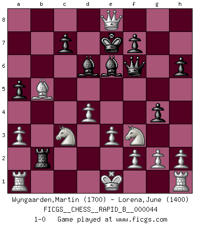 Last move : 1-0 2007 May 9 6:59:10 [Event "FICGS__CHESS__RAPID_B__000044"] [Site "FICGS"] [Date "2007.03.27"] [Round "1"] [White "Wyngaarden,Martin"] [Black "Lorena,June"] [Result "1-0"] [WhiteElo "1700"] [BlackElo "1400"] 1.d4 Nf6 2.c4 e6 3.Nf3 d5 4.Nc3 Bb4 5.Bg5 h6 6.Bxf6 Qxf6 7.e3 Bd7 8.Qb3 a5 9.cxd5 O-O 10.a3 Be7 11.Qxb7 Na6 12.Bxa6 Bd6 13.dxe6 Rfb8 14.Qe4 Bxe6 15.Bd3 Rxb2 16.Qh7+ Kf8 17.Qh8+ Ke7 18.Qxa8 g5 19.Bb5 g4 20.Qe8+ 1-0 Queen's pawn game Kingside Castling by player Black (move 9) Player White won this chess game. Follow this game move after move (download)The sign of a great Master is his ability to win a won game quickly and painlessly. (Irving Chernev) Ein Schachgenie ist jemand der verdammt gut Schach spielt. (Jonathan Levitt) ¿Se han dado cuenta de que Fischer casi nunca ha tenido piezas malas? El las intercambia y las piezas malas se quedan con sus oponenets. (Yuri Balashov) Les échecs sont un jeu par leur forme, un art par leur essence et une science par sa difficulté d'acquisition. Ils peuvent vous procurer autant de plaisir qu'un bon livre ou une belle musique, mais vous n'aurez une réelle joie que si vous arrivez à bien jouer. (Tigran Petrosian) Tomorrow's what you make of it. (Horatio Caine, C.S.I. Miami)