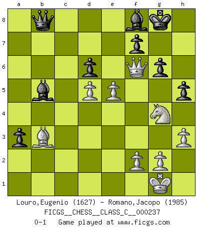 Last move : 0-1 2016 December 19 17:30:55 [Event "FICGS__CHESS__CLASS_C__000237"] [Site "FICGS"] [Date "2016.08.24"] [Round "1"] [White "Louro,Eugenio"] [Black "Romano,Jacopo"] [Result "0-1"] [WhiteElo "1627"] [BlackElo "1985"] 1.e4 c5 2.Nf3 d6 3.c3 Nf6 4.Bd3 Bg4 5.Bc2 Nc6 6.d3 g6 7.Nbd2 Bg7 8.h3 Bd7 9.a3 Qc7 10.O-O O-O 11.Re1 Rac8 12.Nf1 Ne5 13.Bg5 Nxf3+ 14.Qxf3 h6 15.Bh4 b5 16.Bg3 b4 17.axb4 cxb4 18.c4 Nh5 19.Rab1 b3 20.Bxb3 Nxg3 21.Qxg3 Rb8 22.Bc2 Rxb2 23.Rxb2 Bxb2 24.Ne3 e6 25.Rb1 Rb8 26.Qh4 Bg7 27.Rxb8+ Qxb8 28.Ng4 Bc6 29.Qe7 a5 30.d4 a4 31.d5 exd5 32.cxd5 Bb5 33.e5 a3 34.Bb3 Bf8 35.Qf6 h5 0-1 Sicilian Kingside Castling by player White (move 10) Kingside Castling by player Black (move 10) Player Black won this chess game. Follow this game move after move (download)If Chess is a science, it's a most inexact one. If Chess is an art, it is too exacting to be seen as one. If Chess is a sport, it's too esoteric. If Chess is a game, it's too demanding to be just a game. If Chess is a mistress, she's a demanding one. If Chess is a passion, it's a rewarding one. If Chess is life, it's a sad one. (Unknown) Der Vorposten provoziert a) eine Basis für neue Angriffe und b) eine Schwächung der gegnerischen Widerstandskraft in der fraglichen Linie. (Aaron Nimzowitsch) Los Peones son el alma de una partida de Ajedrez. (Francois Andre Danican Philidor) Avant la finale, les dieux ont créé le milieu de partie. (Tarrasch) Luck has a peculiar habit of favoring those who don't depend on it. (Author unknown)