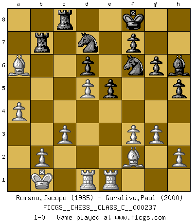 Last move : 1-0 2016 October 8 7:57:32 [Event "FICGS__CHESS__CLASS_C__000237"] [Site "FICGS"] [Date "2016.08.24"] [Round "1"] [White "Romano,Jacopo"] [Black "Guralivu,Paul"] [Result "1-0"] [WhiteElo "1985"] [BlackElo "2000"] 1.e4 c5 2.Nf3 d6 3.d4 cxd4 4.Nxd4 Nf6 5.Nc3 a6 6.Be3 e5 7.Nb3 Be6 8.f3 h5 9.Qd2 Nbd7 10.Nd5 Bxd5 11.exd5 g6 12.O-O-O Qc7 13.Kb1 Nb6 14.Qa5 Rc8 15.c3 Nbd7 16.Qxc7 Rxc7 17.Na5 Bh6 18.Bf2 Ke7 19.Be2 Bf4 20.g3 Bh6 21.a3 Rhc8 22.Rhe1 Kf8 23.a4 Ke7 24.Bf1 Kf8 25.Nxb7 Rxb7 26.Bxa6 1-0 Sicilian : Najdorf, Byrne (English) attack Queenside Castling by player White (move 12) Player White won this chess game. Follow this game move after move (download)Chess is a fighting game which is purely intellectual and includes chance. (Richard Reti) Wer sich die Fähigkeit anerziehen will im Schach selbstständig zu denken, der muß alles meiden, was leblos ist: ausgeklügelte Theorien, die sich auf sehr wenige Beispiele und eine Menge Hirngespinste stützen. (Emanuel Lasker) Los asuntos humanos son como una partida de Ajedrez: solo aquellos que no lo toman seriamente, pueden ser llamados buenos jugadores. (Hung Tzu Ch'eng) La solitude du joueur d'Echecs à l'approche du mat est semblable à celle du condamné. (Francis Szpiner) All men can see these tactics whereby I conquer, but what none can see is the strategy out of which victory is evolved. (Sun Tzu)