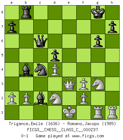 Last move : 0-1 2016 October 15 20:14:22 [Event "FICGS__CHESS__CLASS_C__000237"] [Site "FICGS"] [Date "2016.08.24"] [Round "1"] [White "Trigance,Emile"] [Black "Romano,Jacopo"] [Result "0-1"] [WhiteElo "1636"] [BlackElo "1985"] 1.d4 Nf6 2.Bg5 g6 3.Bxf6 exf6 4.e3 Bg7 5.h4 f5 6.Nd2 c5 7.c3 cxd4 8.exd4 O-O 9.Be2 Re8 10.Qb3 Nc6 11.O-O-O Rb8 12.Bf3 Na5 13.Qc2 d5 14.h5 f4 15.Be2 Rxe2 16.Nxe2 Bf5 17.Qa4 b5 18.Qa3 f3 19.gxf3 b4 20.cxb4 Bf8 21.Qe3 Bxb4 22.Rdg1 Qd7 23.hxg6 fxg6 24.Ng3 Qc6+ 25.Kd1 Bc2+ 26.Ke1 Nc4 0-1 Trompowsky attack (Ruth, Opovcensky Opening) Kingside Castling by player Black (move 8) Queenside Castling by player White (move 11) Player Black won this chess game. Follow this game move after move (download)Any material change in a position must come about by mate, a capture, or a Pawn promotion. (Purdy) Wenn ich einen Club besuche, sind die Spieler stumm vor Staunen. (José Raúl Capablanca) Combinaciones deslumbrantes son para la mayoría, mover madera es para los pocos. (Georg Kieninger) Les échecs c'est le défi de l'alpiniste, toujours plus haut, prêt à tout pour monter à l'assaut du Roi ennemi. Les échecs, c'est de la musique en mouvement, un ballet majestueux pour les yeux. C'est de la poésie composée par les fantômes du passé qui au même titre que Rimbaud ou Verlaine méritent notre admiration. Les échecs, c'est de la peinture ou le moindre mouvement modifie le tableau pour en faire un Picasso ou un Van Gogh. Les échecs, c'est tout et rien, c'est la vie et la mort. Jjulie33 sur le forum de France-Echecs. Computers have lots of memory but no imagination. (Anonymous)