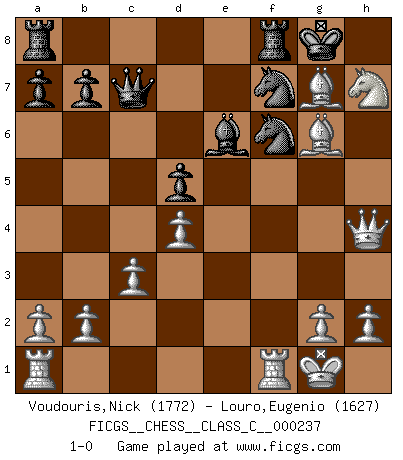 Last move : 1-0 2016 October 4 19:53:25 [Event "FICGS__CHESS__CLASS_C__000237"] [Site "FICGS"] [Date "2016.08.24"] [Round "1"] [White "Voudouris,Nick"] [Black "Louro,Eugenio"] [Result "1-0"] [WhiteElo "1772"] [BlackElo "1627"] 1.d4 Nf6 2.f4 c5 3.e3 d5 4.c3 Nc6 5.Bd3 g6 6.Nf3 cxd4 7.exd4 Bg4 8.Nbd2 Bg7 9.O-O O-O 10.Qe1 Re8 11.Ne5 Qb6 12.Qh4 Bc8 13.Ndf3 h6 14.Nxg6 fxg6 15.Bxg6 Rf8 16.f5 e6 17.fxe6 Bxe6 18.Bxh6 Qc7 19.Ng5 Nd8 20.Nh7 Nf7 21.Bxg7 1-0 Canard Opening Kingside Castling by player White (move 9) Kingside Castling by player Black (move 9) Player White won this chess game. Follow this game move after move (download)Nonsense was the last thing Fischer was interested in, as far as Chess was concerned. (Elie Agur) Sie führen leise Selbstgespräche, schlürfen lautstark ihre Getränke, schmatzen hörbar beim Essen, blasen ihrem Gegenüber Rauch in die Augen, niesen ihm ins Gesicht, starren ihn unverwandt an, bis er sich unter ihren Blicken windet, rutschen ständig auf ihrem Stuhl hin und her, rülpsen und bohren in der Nase. (Anonymous) Un juego de Ajedrez es un dialogo, una conversación entre un jugador y su oponente. Cada movimiento del oponente puede contener amenazas o tropiezos, pero un jugador no se puede defender de las amenazas o tomar ventaja de los tropiezos si es que no se pregunta a sí mismo: ¿Que es lo que mi oponente va a hacer después de cada movida?. (Bruce A. Moon) Les Echecs sont et restent toujours un combat, un combat intégral comme la boxe, la lutte ou un autre sport, et où il doit y avoir un vainqueur et un vaincu. (Joseph Emil Diemer) 98% of all statistics are made up. (Author unknown)