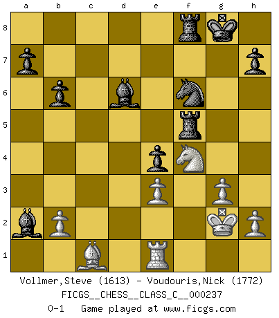 Last move : 0-1 2016 December 3 12:12:19 [Event "FICGS__CHESS__CLASS_C__000237"] [Site "FICGS"] [Date "2016.08.24"] [Round "1"] [White "Vollmer,Steve"] [Black "Voudouris,Nick"] [Result "0-1"] [WhiteElo "1613"] [BlackElo "1772"] 1.d4 d5 2.c4 e6 3.Nc3 f5 4.Nf3 c6 5.cxd5 exd5 6.e3 Bd6 7.Bd3 Nf6 8.Qc2 Ne4 9.Bd2 Nd7 10.Rd1 Qe7 11.O-O O-O 12.Bc1 g5 13.g3 Ndf6 14.Kg2 g4 15.Nh4 Bd7 16.Ne2 Rac8 17.Nf4 c5 18.dxc5 Rxc5 19.Qb3 b6 20.Rfe1 Qe8 21.Bxe4 Qxe4+ 22.f3 gxf3+ 23.Nxf3 Ba4 24.Rd4 Bxb3 25.Rxe4 dxe4 26.Nd4 Bxa2 27.Nxf5 Rxf5 0-1 QGD : 3.Nc3 Kingside Castling by player White (move 11) Kingside Castling by player Black (move 11) Player Black won this chess game. Follow this game move after move (download)The mistakes are there, waiting to be made. (Savielly Tartakower) Wer der Ansicht ist, daß alle Schachspieler verrückt sind, wird durch Studium des Lebens von Emil Josef Diemer nicht auf andere Gedanken kommen. (Hans Ree) Los Peones son nacidos libres, y aún así, se encuentran por doquier encadenados. (Rick Kennedy) Les échecs, c'est la lutte contre l'erreur. (Johannes Zukertort) Life is painting a picture, not doing a sum. (Oliver Wendell Holmes, Jr.)