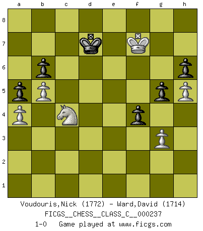 Last move : 1-0 2017 June 10 20:55:41 [Event "FICGS__CHESS__CLASS_C__000237"] [Site "FICGS"] [Date "2016.08.24"] [Round "1"] [White "Voudouris,Nick"] [Black "Ward,David"] [Result "1-0"] [WhiteElo "1772"] [BlackElo "1714"] 1.d4 d5 2.e3 c5 3.c3 Nc6 4.f4 Nf6 5.Bd3 Bg4 6.Nf3 e6 7.Nbd2 Bd6 8.Nf1 Ne4 9.h3 Bh5 10.dxc5 Bxc5 11.Bxe4 dxe4 12.Qxd8+ Rxd8 13.Ng5 Bg6 14.Ng3 Rd3 15.N5xe4 Bxe3 16.Ke2 Bxc1 17.Raxc1 Rd5 18.Rhd1 Rxd1 19.Rxd1 Ke7 20.Ke3 Rd8 21.Rxd8 Nxd8 22.c4 f6 23.Nc3 Nc6 24.Nge2 e5 25.fxe5 Nxe5 26.b3 Kd7 27.Ne4 b6 28.Nf4 Bf7 29.Ng3 g6 30.Ne4 Ke7 31.Nc3 f5 32.g3 h6 33.Nb5 Nc6 34.Nd4 Ne5 35.Nb5 Nc6 36.Nd3 Kd7 37.Nd4 Be8 38.b4 a6 39.a4 a5 40.b5 Ne7 41.h4 Kd6 42.Nf3 Bf7 43.Kd4 Be8 44.Nf4 Bd7 45.Ne5 Be8 46.Nd5 Nxd5 47.cxd5 Kc7 48.Nc4 Bf7 49.Ke5 g5 50.d6+ Kb7 51.d7 Kc7 52.Kf6 Kxd7 53.Kxf7 f4 54.h5 1-0 Queen's pawn game Player White won this chess game. Follow this game move after move (download)We cannot resist the fascination of sacrifice, since a passion for sacrifices is part of a Chessplayer's nature. (Rudolf Spielman) Wer nie einen Fehler gemacht hat, hat nie etwas Neues ausprobiert. (Albert Einstein) En partidas rápidas, el Caballo es mas poderoso que el Alfil. (Vlastimil Hort) À la honte des hommes, on sait que les lois du jeu sont les seules qui soient partout justes, claires, inviolables et exécutées. Pourquoi l'Indien qui a donné les règles du jeu d'échecs est-il obéi de bon gré dans toute la terre, et que les décrétales des papes, par exemple, sont aujourd'hui un objet d'horreur et de mépris ? C'est que l'inventeur des échecs combina tout avec justesse pour la satisfaction des joueurs, et que les papes, dans leurs décrétales, n'eurent en vue que leur seul avantage. L'Indien voulut exercer également l'esprit des hommes et leur donner du plaisir; les papes ont voulu abrutir l'esprit des hommes. Voltaire (Dictionnaire philosophique / Garnier 1967) Wisdom is the reward you get for a lifetime of listening when you'd have preferred to talk. (Doug Larson)