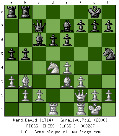 Last move : 1-0 2017 January 22 0:32:1 [Event "FICGS__CHESS__CLASS_C__000237"] [Site "FICGS"] [Date "2016.08.24"] [Round "1"] [White "Ward,David"] [Black "Guralivu,Paul"] [Result "1-0"] [WhiteElo "1714"] [BlackElo "2000"] 1.e4 c5 2.Nf3 d6 3.d4 cxd4 4.Nxd4 Nf6 5.Nc3 a6 6.Bc4 e6 7.Bb3 b5 8.O-O Be7 9.Qf3 Qc7 10.Qg3 O-O 11.Bh6 Ne8 12.Be3 Nf6 13.Bh6 Ne8 14.Be3 Bd7 15.Nce2 Nc6 16.Nxc6 Bxc6 17.f3 a5 18.a3 Nf6 19.Rad1 Nh5 20.Qf2 Rfb8 21.Nd4 1-0 Sicilian : Najdorf, Lipnitzky attack Kingside Castling by player White (move 8) Kingside Castling by player Black (move 10) Player White won this chess game. Follow this game move after move (download)Chess is like war on a board. (Bobby Fischer) Das Schachspiel ist ein See, in welchem eine Mücke baden und ein Elefant ertrinken kann. (Emanuel Lasker) No hay otro maestro que tenga una voluntad terrífica de ganar. Al tablero, el irradía peligro y aún los oponentes mas fuertes tienden a congelarse como liebres cuando olfatean a una pantera. Aún sus debilidades son peligrosas. Con las blancas, su juego de apertura es predecible - te es posible hacer planes en su contra - pero es tan fuerte que tus planes casi nunca funcionan. En el juego medio, su precisión e invención son fabulosas y en finales, tú simplemente no le puedes vencer. (Experto Alemán anónimo) Le plus grand jeu de l'esprit jamais inventé, plus vous l'apprenez, plus vous y prenez du plaisir. (Garry Kasparov) At work, the authority of a person is inversely proportional to the number of pens that person is carrying. (Dan Rotaru)