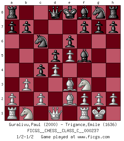Last move : 1/2-1/2 2016 September 14 7:52:55 [Event "FICGS__CHESS__CLASS_C__000237"] [Site "FICGS"] [Date "2016.08.24"] [Round "1"] [White "Guralivu,Paul"] [Black "Trigance,Emile"] [Result "1/2-1/2"] [WhiteElo "2000"] [BlackElo "1636"] 1.e4 c6 2.d4 d5 3.e5 Bf5 4.Nf3 e6 5.Be2 c5 6.Be3 c4 7.O-O Nc6 8.b3 1/2-1/2 Caro-Kann : Advance variation Kingside Castling by player White (move 7) This chess game ended in a draw. Follow this game move after move (download)Fischer Chess play was always razor-sharp, rational and brilliant. One of the best ever. (Dave Regis) In der Schule lernt man nichts. Es ist nur Zeitverschwendung. (Robert James Fischer) En posiciones complicadas, Bobby Fischer pocas veces tuvo que temer de cualquiera. (Paul Keres) L'attaque fait le spectacle, la défense gagne les matchs. (Dicton footballistique) Gambling : The sure way of getting nothing from something. (Wilson Mizner)