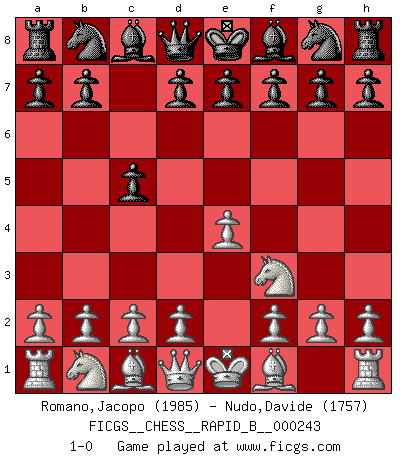 Last move : 1-0 2016 September 28 11:19:42 [Event "FICGS__CHESS__RAPID_B__000243"] [Site "FICGS"] [Date "2016.08.25"] [Round "1"] [White "Romano,Jacopo"] [Black "Nudo,Davide"] [Result "1-0"] [WhiteElo "1985"] [BlackElo "1757"] 1.e4 c5 2.Nf3 1-0 This chess game has been lost on time (started : 2016.08.25 9:35:46) Sicilian defense Player White won this chess game. Follow this game move after move (download)What is the object of playing a gambit opening?... To acquire a reputation of being a dashing player at the cost of losing a game. (Siegbert Tarrasch) Stil? Ich habe keinen Stil! (Anatoly Karpov) El Ajedrez es parte de una cultura y si una cultura esta en decadencia, entonces también el Ajedrez declinará. (Mikhail Botvinnik) Dieu déplace le joueur, et celui-ci la pièce. Quel Dieu derrière Dieu commence donc la trame ? Arturo Perez-Reverte (prix de littérature policière 1993). I don't know, I don't care, and it doesn't make any difference. (Albert Einstein)