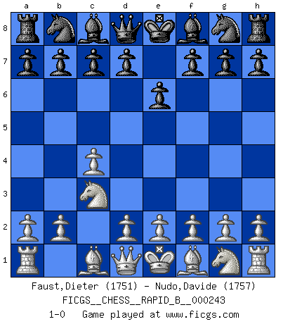 Last move : 1-0 2016 September 25 22:59:44 [Event "FICGS__CHESS__RAPID_B__000243"] [Site "FICGS"] [Date "2016.08.25"] [Round "1"] [White "Faust,Dieter"] [Black "Nudo,Davide"] [Result "1-0"] [WhiteElo "1751"] [BlackElo "1757"] 1.c4 e6 2.Nc3 1-0 This chess game has been lost on time (started : 2016.08.25 9:35:46) English Opening Player White won this chess game. Follow this game move after move (download)Different people feel differently about resigning. (Bobby Fischer) Um sich vor der Gefahr einer Erkältung zu schützen, sorge der wanderlustige König beizeiten für ein brauchbares Versteck. (Aaron Nimzowitsch) Solo el jugador con la iniciativa tiene el derecho a atacar. (Wilhelm Steinitz) Des idées, des idées, j'en ai cent, j'en ai mille. Des bonnes, des mauvaises, applicables, irréalisables... Il suffit de faire le tri ! (Roos) The right perception of any matter and a misunderstanding of the same matter do not wholly exclude each other. (Kafka's the trial)