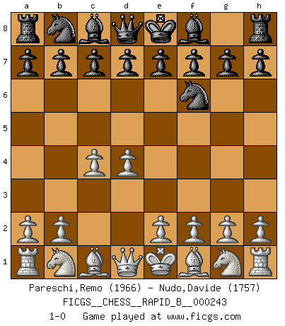 Last move : 1-0 2016 September 25 22:59:44 [Event "FICGS__CHESS__RAPID_B__000243"] [Site "FICGS"] [Date "2016.08.25"] [Round "1"] [White "Pareschi,Remo"] [Black "Nudo,Davide"] [Result "1-0"] [WhiteElo "1966"] [BlackElo "1757"] 1.d4 Nf6 2.c4 1-0 This chess game has been lost on time (started : 2016.08.25 9:35:46) Queen's pawn game Player White won this chess game. Follow this game move after move (download)If one piece is badly posted, the whole game is bad. (Tarrasch) Frage: Gibt es etwas was Sie mehr lieben als Autobahnen ohne Tempobegrenzungen? - Antwort: Deutsche Frauen ohne Tempobegrenzungen. (Loek van Wely) Jugadores de primera clase pierden en contra de jugadores de segunda clase porque los jugadores de segunda clase a veces juegan una partida de primer clase. (Siegbert Tarrasch) 'L'échange des dames est un coup dur pour les deux adversaires...' Un journaliste lors d'une partie du match Spassky-Fischer Think like a man of action, act like a man of thought. (Henri Louis Bergson)