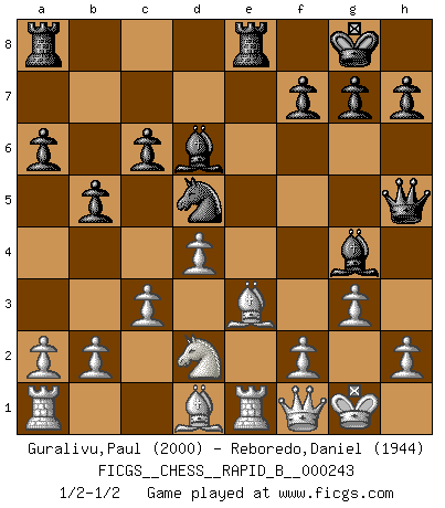 Last move : 1/2-1/2 2016 September 14 2:53:15 [Event "FICGS__CHESS__RAPID_B__000243"] [Site "FICGS"] [Date "2016.08.25"] [Round "1"] [White "Guralivu,Paul"] [Black "Reboredo,Daniel"] [Result "1/2-1/2"] [WhiteElo "2000"] [BlackElo "1944"] 1.e4 e5 2.Nf3 Nc6 3.Bb5 a6 4.Ba4 Nf6 5.O-O Be7 6.Re1 b5 7.Bb3 O-O 8.c3 d5 9.exd5 Nxd5 10.Nxe5 Nxe5 11.Rxe5 c6 12.d4 Bd6 13.Re1 Qh4 14.g3 Qh3 15.Be3 Be6 16.Qd3 Rfe8 17.Nd2 Bf5 18.Qe2 Bg4 19.Qf1 Qh5 20.Bd1 1/2-1/2 Ruy Lopez : Closed, 7...O-O Kingside Castling by player White (move 5) Kingside Castling by player Black (move 7) This chess game ended in a draw. Follow this game move after move (download)Chess is a forcing house where the fruits of character can ripen more fully than in life. (Edward Morgan Foster) Ein Schachgenie ist jemand der verdammt gut Schach spielt. (Jonathan Levitt) No es suficiente ser un buen jugador, se debe también de jugar bién. (Siegbert Tarrasch) À la honte des hommes, on sait que les lois du jeu sont les seules qui soient partout justes, claires, inviolables et exécutées. Pourquoi l'Indien qui a donné les règles du jeu d'échecs est-il obéi de bon gré dans toute la terre, et que les décrétales des papes, par exemple, sont aujourd'hui un objet d'horreur et de mépris ? C'est que l'inventeur des échecs combina tout avec justesse pour la satisfaction des joueurs, et que les papes, dans leurs décrétales, n'eurent en vue que leur seul avantage. L'Indien voulut exercer également l'esprit des hommes et leur donner du plaisir; les papes ont voulu abrutir l'esprit des hommes. Voltaire (Dictionnaire philosophique / Garnier 1967) Wikichess, chess moves explained by 'experimented' players. (Thibault de Vassal)