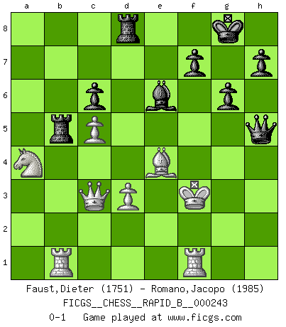 Last move : 0-1 2016 October 20 15:58:58 [Event "FICGS__CHESS__RAPID_B__000243"] [Site "FICGS"] [Date "2016.08.25"] [Round "1"] [White "Faust,Dieter"] [Black "Romano,Jacopo"] [Result "0-1"] [WhiteElo "1751"] [BlackElo "1985"] 1.c4 Nf6 2.Nc3 g6 3.Nf3 Bg7 4.g3 O-O 5.Bg2 d6 6.O-O Nc6 7.Rb1 a5 8.a3 e5 9.d3 Nd4 10.b4 axb4 11.axb4 c6 12.b5 Bg4 13.Re1 Nxf3+ 14.exf3 Bf5 15.f4 Qd7 16.Na4 Qc7 17.fxe5 Ng4 18.exd6 Qxd6 19.h3 Nxf2 20.Kxf2 Rfe8 21.Be4 Bxh3 22.Be3 Bd4 23.bxc6 bxc6 24.c5 Bxe3+ 25.Kxe3 Qxg3+ 26.Kd2 Bg4 27.Qc2 Red8 28.Qc4 Ra5 29.Rf1 Be6 30.Qb4 Rb5 31.Qc3 Qh2+ 32.Ke3 Qh6+ 33.Kf3 Qh5+ 0-1 English Opening Kingside Castling by player Black (move 4) Kingside Castling by player White (move 6) Player Black won this chess game. Follow this game move after move (download)Chess is 99 percent tactics. (Teichmann) Nie in meinem Leben habe ich die französische Verteidigung gespielt, welche die Stumpfsinnigste von allen ist. (Wilhelm Steinitz) No solamente yo pronostico su triunfo sobre Botvinnik, sino que me adelanto y digo que probablemente Fischer es el jugador de Ajedrez mas grande que haya existido. (John Collins) Le jeu d'échecs fait naître et fortifie en nous plusieurs qualités précieuses dans le cours de l'existence, telles que la prévoyance, la circonspection, la prudence, et la persévérance. (Benjamin Franklin - 1783, la morale des échecs) You have to believe in yourself. (Sun Tzu)