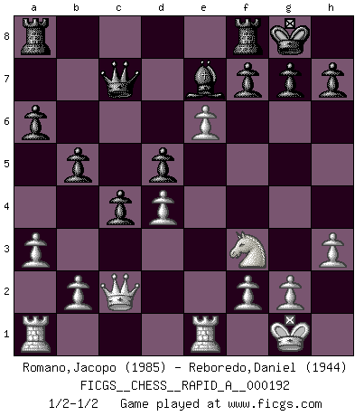 Last move : 1/2-1/2 2016 September 24 1:38:7 [Event "FICGS__CHESS__RAPID_A__000192"] [Site "FICGS"] [Date "2016.08.25"] [Round "1"] [White "Romano,Jacopo"] [Black "Reboredo,Daniel"] [Result "1/2-1/2"] [WhiteElo "1985"] [BlackElo "1944"] 1.e4 e5 2.Nf3 Nc6 3.Bb5 a6 4.Ba4 Nf6 5.O-O Be7 6.Re1 b5 7.Bb3 O-O 8.h3 Bb7 9.d3 d6 10.a3 Na5 11.Ba2 c5 12.Nbd2 Bc8 13.c3 Be6 14.d4 Bxa2 15.Rxa2 exd4 16.cxd4 d5 17.e5 Ne4 18.Ra1 Nxd2 19.Bxd2 c4 20.Bxa5 Qxa5 21.e6 Qc7 22.Qc2 1/2-1/2 Ruy Lopez : Closed, 7...O-O Kingside Castling by player White (move 5) Kingside Castling by player Black (move 7) This chess game ended in a draw. Follow this game move after move (download)I played Chess with him and would have beaten him sometimes only he always took back his last move, and ran the game out differently. (Mark Twain) Wie gewinnt Tal? Er entwickelt alle seine Figuren in die Brettmitte und opfert sie dann irgendwo. (Robert James Fischer) Un sacrificio se refuta mucho mejor al aceptarlo. (Wilhelm Steinitz) Lorsque vous vous retrouvez devant une position atroce, ne tendez pas un ultime piège dérisoire avec l'intention d'abandonner si l'adversaire le déjoue ! Faites-vous plutôt un devoir de résister comme si votre vie en dépendait. Jouez le coup qui vous déplairait au centuple si vous étiez dans la peau de votre tortionnaire ! It is a good thing for an uneducated man to read books of quotations. (Winston Churchill)
