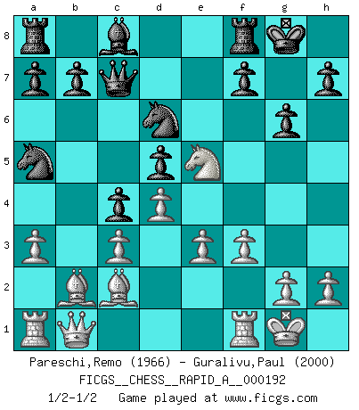 Last move : 1/2-1/2 2016 September 6 0:15:43 [Event "FICGS__CHESS__RAPID_A__000192"] [Site "FICGS"] [Date "2016.08.25"] [Round "1"] [White "Pareschi,Remo"] [Black "Guralivu,Paul"] [Result "1/2-1/2"] [WhiteElo "1966"] [BlackElo "2000"] 1.d4 Nf6 2.c4 e6 3.Nc3 Bb4 4.e3 O-O 5.Nf3 d5 6.Bd3 c5 7.O-O Nc6 8.a3 Bxc3 9.bxc3 Qc7 10.Bb2 Na5 11.cxd5 exd5 12.Ne5 c4 13.Bc2 Ne4 14.f3 Nd6 15.Qb1 g6 1/2-1/2 Nimzo-Indian : 4.e3, Main line with 7...Nc6 Kingside Castling by player Black (move 4) Kingside Castling by player White (move 7) This chess game ended in a draw. Follow this game move after move (download)It is difficult to play against Einstein's theory --on his first loss to Fischer. (Mikhail Tal) Wenn man heute mit 14 Jahren noch kein GM ist, kann man es vergessen. (Viswanathan Anand) Por esta medida (el intervalo entre Fischer y sus contemporaneos), yo le considero el mas grande campeón mundial. (Garry Kasparov) Ce n'est pas pour s'amuser qu'il joue aux échecs : il célèbre un culte. (Vladimir Nabokov) Bobby never cared about money, though. His only desire was to prove that his choices were correct: He wanted chess to be important because he was a chess player, and he wanted to be important. Bobby knew money was important, but he didn't have a clue why, outside of clothes and status. The only way he could accomplish what he wanted was to fight for a lot of money. Once he got it, he gave it away. He did not know how to spend it. And once he'd become champion, after, essentially, sacrificing his life for it, he didn't know how to spend his time. (Bob Wade)