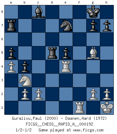 Last move : 1/2-1/2 2016 September 5 21:27:21 [Event "FICGS__CHESS__RAPID_A__000192"] [Site "FICGS"] [Date "2016.08.25"] [Round "1"] [White "Guralivu,Paul"] [Black "Daanen,Aard"] [Result "1/2-1/2"] [WhiteElo "2000"] [BlackElo "1972"] 1.e4 c5 2.Nf3 d6 3.d4 cxd4 4.Nxd4 Nf6 5.Nc3 a6 6.Be2 e5 7.Nb3 Be7 8.O-O O-O 9.Kh1 Nc6 10.f4 b5 11.a4 b4 12.Nd5 Nxe4 13.Bf3 f5 14.Nxe7+ Nxe7 15.fxe5 dxe5 16.Qxd8 Rxd8 17.Bg5 Ra7 18.Bxe4 fxe4 19.Rae1 Rd5 20.Rxe4 a5 1/2-1/2 Sicilian : Najdorf, Opovcensky variation Kingside Castling by player White (move 8) Kingside Castling by player Black (move 8) This chess game ended in a draw. Follow this game move after move (download)Robert Fischer is a law unto himself. (Larry Evans) Ich suche im Schach immer etwas Eigenes. Riskantes Spiel im Stile schachlicher Musketiere ist nicht meine Sache, auch wenn es vielen Freunden scharfer Wendungen gefällt. (Anatoly Karpov) Buenas posiciones no logran ganar juegos, buenas movidas sí. (Gerald Abrahams) Karpov est une pièce de musée. (Garry Kasparov) Always two there are. No more no less. A master, and an apprentice. (Master Yoda in Star Wars ep.1)