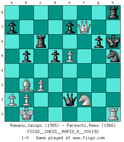 Last move : 1-0 2016 October 29 22:35:1 [Event "FICGS__CHESS__RAPID_A__000192"] [Site "FICGS"] [Date "2016.08.25"] [Round "1"] [White "Romano,Jacopo"] [Black "Pareschi,Remo"] [Result "1-0"] [WhiteElo "1985"] [BlackElo "1966"] 1.e4 c5 2.Nf3 d6 3.d4 cxd4 4.Nxd4 Nf6 5.Nc3 g6 6.Be3 Bg7 7.f3 O-O 8.Qd2 Nc6 9.Bc4 Bd7 10.O-O-O Qa5 11.Bb3 Rfc8 12.h4 h5 13.Kb1 Rab8 14.Rhe1 b5 15.Nxc6 Rxc6 16.Bh6 Kh7 17.Bxg7 Kxg7 18.g4 hxg4 19.h5 Nxh5 20.Rh1 Rh8 21.fxg4 Bxg4 22.Qd5 Bxd1 23.Qxf7+ Kh6 24.Nxd1 Qd2 25.Nf2 Qe2 26.c3 d5 27.e5 1-0 Sicilian : Dragon, Yugoslav attack, 7...O-O Kingside Castling by player Black (move 7) Queenside Castling by player White (move 10) Player White won this chess game. Follow this game move after move (download)I like the moment when I break a man's ego. (Bobby Fischer) Der Partner hat auch seine Existenzberechtigung. (Savielly Grigorievitsch Tartakower) Juega la Apertura como un libro, el Juego Medio como un mago y los Finales como una máquina. (Spielmann) Le jeu d'échecs fait naître et fortifie en nous plusieurs qualités précieuses dans le cours de l'existence, telles que la prévoyance, la circonspection, la prudence, et la persévérance. (Benjamin Franklin - 1783, la morale des échecs) In every real man a child is hidden that wants to play. (Friedrich Nietzsche)
