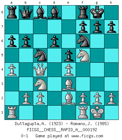 Last move : 0-1 2016 October 16 12:44:44 [Event "FICGS__CHESS__RAPID_A__000192"] [Site "FICGS"] [Date "2016.08.25"] [Round "1"] [White "Duttagupta,Aniruddha"] [Black "Romano,Jacopo"] [Result "0-1"] [WhiteElo "1923"] [BlackElo "1985"] 1.e4 c5 2.Nf3 d6 3.d4 cxd4 4.Nxd4 Nf6 5.Nc3 a6 6.Be3 e5 7.Nf3 Qc7 8.a4 Be7 9.Be2 O-O 10.O-O b6 11.Qd3 Nbd7 12.Qc4 Qb8 13.Nh4 Nc5 14.Nf5 Bd8 0-1 This chess game has been lost on time (started : 2016.08.25 19:7:25) Sicilian : Najdorf, Byrne (English) attack Kingside Castling by player Black (move 9) Kingside Castling by player White (move 10) Player Black won this chess game. Follow this game move after move (download)Let the perfectionist play postal. (Yasser Seirawan) Weshalb minderdergeübte Spieler mit g2-g4 beginnen? Die betreffenden sind unschlüssig, ob sie nun rechts (h4) oder links (f4) beginnen sollen, und in ihrer Ratlosigkeit entschliessen sie sich nach guter Bürgerart dazu, den goldenen Mittelweg zu wählen. (Aaron Nimzowitsch) Peones: ellos son el alma de esta partida, solos forman el ataque y la defensa. (Philidor) Roi des jeux et jeu des rois, les échecs portent en eux un sentiment d'infini. Ils donnent à celui qui s'est efforcé d'en approfondir les arcanes l'impression de n'être pas à la mesure de l'homme; en fait, ils constituent un résumé de l'univers, un microcosme, et figurent cette grande échelle qui, dans les plans de la lumière descend jusqu'à la matière, qui des abîmes insondables remonte jusqu'en l'infini de Dieu. (Pyrame) It's not the will to win, but the will to prepare to win that makes the difference. (Bear Bryant)