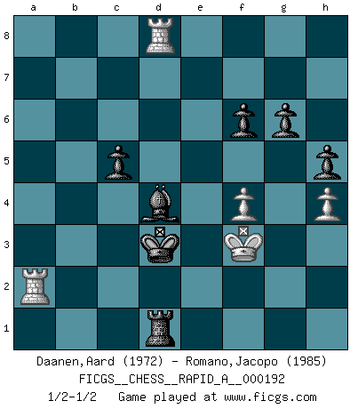 Last move : 1/2-1/2 2016 October 1 19:10:15 [Event "FICGS__CHESS__RAPID_A__000192"] [Site "FICGS"] [Date "2016.08.25"] [Round "1"] [White "Daanen,Aard"] [Black "Romano,Jacopo"] [Result "1/2-1/2"] [WhiteElo "1972"] [BlackElo "1985"] 1.e4 c5 2.Nf3 d6 3.d4 cxd4 4.Nxd4 Nf6 5.Nc3 a6 6.Be3 e5 7.Nb3 Be6 8.Qd2 Nbd7 9.f3 h5 10.Nd5 Bxd5 11.exd5 g6 12.Be2 Bg7 13.O-O b6 14.c4 O-O 15.Rae1 Re8 16.Na1 e4 17.Nc2 b5 18.cxb5 axb5 19.Bxb5 exf3 20.gxf3 Rxa2 21.Rb1 Ra5 22.Bc6 Re7 23.Nb4 Qc8 24.Bd4 Ne5 25.Bxe5 Rxe5 26.Nd3 Rexd5 27.Bxd5 Rxd5 28.Qe2 Kh7 29.Rbd1 Rf5 30.Kh1 Qb7 31.Ra1 Nd7 32.Ra4 Nc5 33.Nxc5 dxc5 34.Re4 Bd4 35.Rb1 Qb3 36.Kg2 Rg5+ 37.Kh1 Kg7 38.Rf1 Rf5 39.Re7 Bf6 40.Re4 Rd5 41.Qc4 Qxc4 42.Rxc4 Bxb2 43.Re1 Bf6 44.h4 Be5 45.Rce4 Kf6 46.R1e2 Kf5 47.Kg2 f6 48.Rc2 Bd4 49.Kg3 Rd7 50.Rf4+ Ke6 51.Re4+ Kd5 52.Re8 Rd6 53.Rc8 Rb6 54.Re2 Kc4 55.Ra2 Rb3 56.Rg8 Rb1 57.f4 Kd3 58.Rd8 Rg1+ 59.Kf3 Rf1+ 60.Kg3 Rd1 61.Kf3 1/2-1/2 Sicilian : Najdorf, Byrne (English) attack Kingside Castling by player White (move 13) Kingside Castling by player Black (move 14) This chess game ended in a draw. Follow this game move after move (download)Bobby just drops the pieces and they fall on the right squares. (Miguel Najdorf) Frage: Gibt es etwas was Sie mehr lieben als Autobahnen ohne Tempobegrenzungen? - Antwort: Deutsche Frauen ohne Tempobegrenzungen. (Loek van Wely) Jugadores de primera clase pierden en contra de jugadores de segunda clase porque los jugadores de segunda clase a veces juegan una partida de primer clase. (Siegbert Tarrasch) La conception d'un plan est le processus par lequel un joueur exploite les avantages de sa position tout en s'efforçant d'en réduire au minimum les inconvénients. Afin de garantir le succès, un plan doit toujours se fonder sur un diagnostic objectif des particularités d'une position. La conception d'un plan est d'autant plus difficile que la position est équilibrée, et grandement facilitée lorsqu'il n'existe qu'un seul plan susceptible de répondre aux exigences de la position. (Harry Golombek) After growing wildly for years, the field of computing appears to be reaching its infancy. (John Pierce)