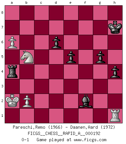 Last move : 0-1 2016 December 12 7:6:38 [Event "FICGS__CHESS__RAPID_A__000192"] [Site "FICGS"] [Date "2016.08.25"] [Round "1"] [White "Pareschi,Remo"] [Black "Daanen,Aard"] [Result "0-1"] [WhiteElo "1966"] [BlackElo "1972"] 1.d4 Nf6 2.c4 g6 3.Nc3 Bg7 4.e4 d6 5.Nge2 O-O 6.Ng3 e5 7.d5 a5 8.Be2 Na6 9.h4 h5 10.Bg5 Qe8 11.Nf1 Bd7 12.f3 Nh7 13.Be3 f5 14.Nd2 a4 15.Nb5 Qe7 16.a3 Nf6 17.Bg5 f4 18.g4 fxg3 19.Qxa4 c6 20.Nc3 cxd5 21.Nxd5 Qf7 22.Qb3 Nc5 23.Qe3 Ne6 24.Nb6 Nh7 25.Qg1 Nhxg5 26.hxg5 Ra6 27.Nd5 Nxg5 28.Qxg3 Ne6 29.O-O-O Ba4 30.Rdf1 Kh7 31.Kb1 Bh6 32.Qe1 Nf4 33.Ka1 Rc8 34.Rf2 Ra7 35.Rfh2 Bc6 36.Qd1 b5 37.cxb5 Nxd5 38.Bc4 Bxb5 39.Bxd5 Qe8 40.Nb1 Rac7 41.Bb3 Be3 42.Ka2 Bf4 43.Rc2 Rxc2 44.Bxc2 Rc4 45.Nc3 Rd4 46.Qg1 Bc4+ 47.Bb3 Bxb3+ 48.Kxb3 Qb8+ 49.Ka2 Rd2 50.Qb1 Be3 51.Re1 Bd4 52.Qc1 Rd3 53.Ne2 Qb3+ 54.Kb1 Bf2 55.Rh1 Qf7 56.Qc2 Rxf3 57.Qd1 Qb7 58.Ka2 Qxe4 59.Nc3 Qc6 60.a4 Bd4 61.Nb5 Rf4 62.Rh2 h4 63.Qh1 Qxh1 64.Rxh1 Bf2 65.a5 g5 66.a6 Ra4+ 0-1 King's Indian : Kramer system Kingside Castling by player Black (move 5) Queenside Castling by player White (move 29) Player Black won this chess game. Follow this game move after move (download)Chess is a beautiful mistress. (Bent Larsen) Im Hotelzimmer gab es nur zwei Schaben. (Über die Turnierbedingungen) (Peter Swidler) Un buen jugador siempre tiene buena suerte. (José Raúl Capablanca) RxDa4 pat (...) Tomorrow's what you make of it. (Horatio Caine, C.S.I. Miami)