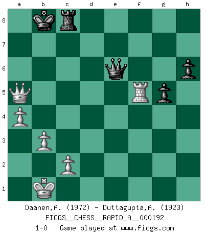 Last move : 1-0 2016 November 20 19:5:29 [Event "FICGS__CHESS__RAPID_A__000192"] [Site "FICGS"] [Date "2016.08.25"] [Round "1"] [White "Daanen,Aard"] [Black "Duttagupta,Aniruddha"] [Result "1-0"] [WhiteElo "1972"] [BlackElo "1923"] 1.e4 e6 2.d4 d5 3.Nc3 Nf6 4.e5 Nfd7 5.f4 c5 6.Nf3 Nc6 7.Be3 cxd4 8.Nxd4 Bc5 9.Qd2 O-O 10.O-O-O a6 11.Qf2 Bxd4 12.Bxd4 b5 13.Be3 b4 14.Na4 a5 15.h4 Ba6 16.h5 Qc7 17.h6 g6 18.Kb1 Bxf1 19.Rhxf1 Rfc8 20.g4 Ne7 21.Rg1 Qc6 22.b3 Kf8 23.f5 exf5 24.Bg5 Nc5 25.Bxe7+ Kxe7 26.gxf5 Ne4 27.Qh4+ Kf8 28.Rg2 Rc7 29.e6 g5 30.Qh2 fxe6 31.fxe6 Re7 32.Qe5 Qxe6 33.Qh8+ Qg8 34.Qd4 Ra6 35.Rf1+ Rf7 36.Re1 Rf5 37.Nc5 Rxh6 38.Nxe4 dxe4 39.Qxe4 Qf7 40.Qd4 Re6 41.Qh8+ Ke7 42.Rge2 Rxe2 43.Rxe2+ Kd7 44.a4 Rf6 45.Ka2 Rc6 46.Qe5 Qg6 47.Qd5+ Kc8 48.Kb1 h6 49.Qxa5 Kb8 50.Qxb4+ Ka8 51.Qa5+ Kb8 52.Rf2 Qe6 53.Rf8+ Rc8 54.Rf5 1-0 French : Steinitz, Boleslavsky variation Kingside Castling by player Black (move 9) Queenside Castling by player White (move 10) Player White won this chess game. Follow this game move after move (download)If Chess is a science, it's a most inexact one. If Chess is an art, it is too exacting to be seen as one. If Chess is a sport, it's too esoteric. If Chess is a game, it's too demanding to be just a game. If Chess is a mistress, she's a demanding one. If Chess is a passion, it's a rewarding one. If Chess is life, it's a sad one. (Unknown) Du musst Deinen Gegner in einen tiefen dunklen Wald führen wo 2+2=5 ist und wo der Weg, der wieder hinausführt, nur breit genug für einen ist. (Mikhail Nekhemyevich Tal) El jugador táctico sabe que hacer cuando hay algo que hacer; mientras que el estratega sabe que hacer cuando no hay nada que hacer. (Gerald Abrahams) La vie et les Echecs sont tous les deux une lutte constante. (Lasker) Nowadays, anyone who cannot speak English and is incapable of using the Internet is regarded as backward. (Al-Waleed bin Talal)