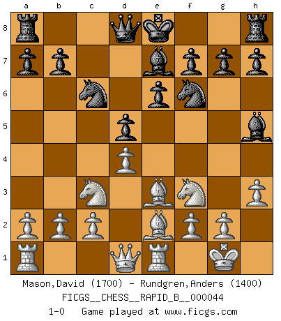 Last move : 1-0 2007 May 9 8:18:47 [Event "FICGS__CHESS__RAPID_B__000044"] [Site "FICGS"] [Date "2007.03.27"] [Round "1"] [White "Mason,David"] [Black "Rundgren,Anders"] [Result "1-0"] [WhiteElo "1700"] [BlackElo "1400"] 1.e4 c6 2.Nc3 d5 3.Nf3 Bg4 4.exd5 cxd5 5.d4 Nc6 6.Be2 e6 7.O-O Nf6 8.Be3 Be7 9.h3 Bh5 10.Re1 1-0 This chess game has been lost on time (started : 2007.03.27 5:42:57) Caro-Kann : Two knights, 3...Bg4 Kingside Castling by player White (move 7) Player White won this chess game. Follow this game move after move (download)The older I grow, the more I value Pawns. (Keres) Alle offensichtlichen Züge sehen nach dem Spiel in der Analyse verdächtig aus. (Viktor Kortschnoi) Combinaciones deslumbrantes son para la mayoría, mover madera es para los pocos. (Georg Kieninger) Le joueur d'Echecs qui veut atteindre le top est obligé de développer son propre credo créatif. Alexeï Stepanovicth Souétine. Il est facile d'écrire des livres ! Ce qui est difficile, c'est de jouer ! (Alexeï Stepanovicth Souétine) It's not the size of the dog in the fight, it's the size of the fight in the dog. (Mark Twain)