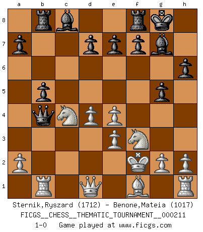Last move : 1-0 2016 October 30 23:3:58 [Event "FICGS__CHESS__THEMATIC_TOURNAMENT__000211"] [Site "FICGS"] [Date "2016.08.29"] [Round "1"] [White "Sternik,Ryszard"] [Black "Benone,Mateia"] [Result "1-0"] [WhiteElo "1712"] [BlackElo "1017"] 1.d4 Nf6 2.Bg5 Ne4 3.Bf4 c5 4.f3 g5 5.Bxb8 Rxb8 6.fxe4 Bg7 7.c3 cxd4 8.cxd4 Qb6 9.e3 Qxb2 10.Nd2 O-O 11.Ngf3 h6 12.Nc4 Qc3+ 13.Kf2 b5 14.Rc1 Qb4 15.Rb1 1-0 Trompowsky attack (Ruth, Opovcensky Opening) Kingside Castling by player Black (move 10) Player White won this chess game. Follow this game move after move (download)An attack on the wing should be met by play in the center. (Nimzovitch) Der Schachmeister von Heute braucht Courage, einen Killerinstinkt, Ausdauer und Arroganz. (Larry Evans) El Ajedrez es un terrible juego. Si no controlas el centro, tu oponente tiene una posición mas holgada. Si tienes control del centro, ¡entonces realmente tu tienes algo de que preocuparte!. (Siegbert Tarrasch) Un journaliste : 'Vous préférez avoir une dame de plus sur l'échiquier ou au lit ?' Boris Spassky : 'Ca dépend de la position.' A married woman is like a fish riding a bicycle. (Rodolfo d'Ettorre)