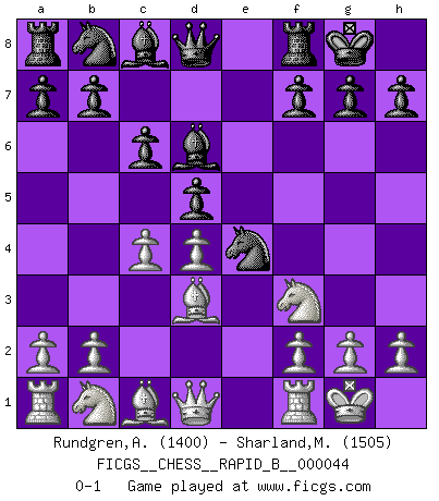 Last move : 0-1 2007 May 15 15:14:58 [Event "FICGS__CHESS__RAPID_B__000044"] [Site "FICGS"] [Date "2007.03.27"] [Round "1"] [White "Rundgren,Anders"] [Black "Sharland,Michael"] [Result "0-1"] [WhiteElo "1400"] [BlackElo "1505"] 1.e4 e5 2.Nf3 Nf6 3.Nxe5 d6 4.Nf3 Nxe4 5.d4 d5 6.Bd3 Bd6 7.O-O O-O 8.c4 c6 0-1 This chess game has been lost on time (started : 2007.03.27 5:42:57) Petrov : Classical attack, Marshall variation Kingside Castling by player White (move 7) Kingside Castling by player Black (move 7) Player Black won this chess game. Follow this game move after move (download)Combinations have always been the most intriguing aspect of Chess. The masters look for them, the public applauds them, the critics praise them. It is because combinations are possible that Chess is more than a lifeless mathematical exercise. They are the poetry of the game; they are to Chess what melody is to music. They represent the triumph of mind over matter. (Reuben Fine) Alles was am Schachbrett zählt sind gute Züge. (Robert James Fischer) Es muy difícil jugar en contra de la teoría de Einstein. - en su primera derrota en contra de Fischer (Mikhail Tal) Les erreurs sont comme les malheurs, elles n'arrivent jamais seules. (Siegbert Tarrasch) Memory... is the diary that we all carry with us. (Oscar Wilde, The Importance of Being Earnest)