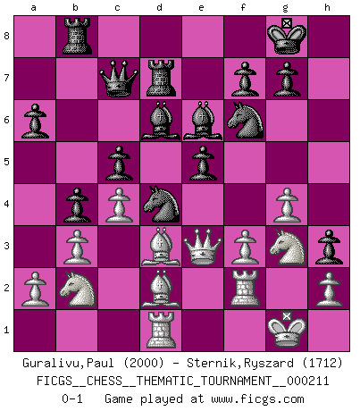 Last move : 0-1 2017 January 16 0:8:45 [Event "FICGS__CHESS__THEMATIC_TOURNAMENT__000211"] [Site "FICGS"] [Date "2016.08.29"] [Round "1"] [White "Guralivu,Paul"] [Black "Sternik,Ryszard"] [Result "0-1"] [WhiteElo "2000"] [BlackElo "1712"] 1.d4 Nf6 2.Bg5 Ne4 3.Bf4 c5 4.f3 Qa5+ 5.c3 Nf6 6.d5 Qb6 7.Qc1 Nxd5 8.Bd2 Nc6 9.Na3 e6 10.e4 Nf6 11.Bf4 d5 12.exd5 Nxd5 13.Bg3 Be7 14.Qd2 O-O 15.Bd3 Rd8 16.Ne2 e5 17.Nc4 Qc7 18.b3 h5 19.O-O h4 20.Bf2 b5 21.Nb2 h3 22.g3 Nf6 23.Qe3 a6 24.c4 Rb8 25.Be1 Be6 26.Bd2 Bd6 27.Rac1 Rd7 28.Rcd1 Qb6 29.g4 Nd4 30.Rf2 Qc7 31.Ng3 b4 0-1 Trompowsky attack (Ruth, Opovcensky Opening) Kingside Castling by player Black (move 14) Kingside Castling by player White (move 19) Player Black won this chess game. Follow this game move after move (download)Botvinnik tried to take the mystery out of Chess, always relating it to situations in ordinary life. He used to call Chess a typical inexact problem similar to those which people are always having to solve in everyday life. (Garry Kasparov) Du weisst es gibt ein Problem mit Computern und Fernschach, wenn jeder eine Rating von 2450 hat. (John Christen Knudsen) Debemos de asegurarnos de que el Ajedrez no se convierta en un lenguaje muerto, muy interesante, pero tan solo para un grupo muy pequeño. (Sytze Faber) Le pion, dans sa simplicité, marche droit devant lui, mais lorsqu'il prend, il le fait obliquement? Ainsi l'homme, tant qu'il reste pauvre, marche dans la droiture et vit honnêtement, mais lorsqu'il recherche les honneurs, il flatte, se parjure et, par les voies obliques, cherche une position supérieure sur l'échiquier du monde. (Jean de Galles) I think your argument is specious - I think your tie is ugly. (Gregory House to Dr. Foreman, House M.D.)