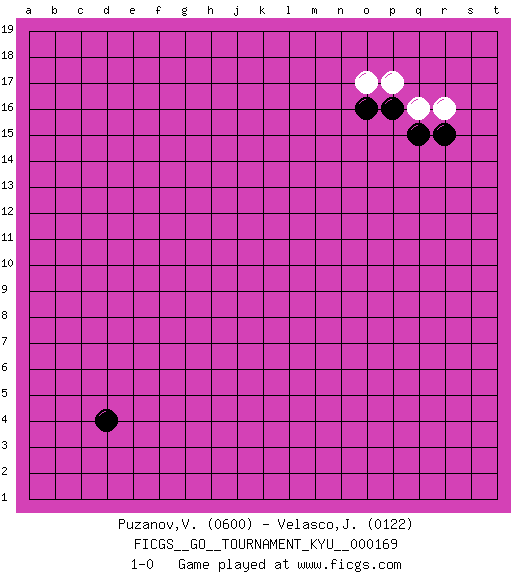 Last move : 1-0 2016 October 9 0:52:18 [Event "FICGS__GO__TOURNAMENT_KYU__000169"] [Site "FICGS"] [Date "2016.09.01"] [Round "1"] [Black "Puzanov,Vasyl"] [White "Velasco,Jose Maria"] [Result "1-0"] [Rating 1 "0600"] [Rating 2 "0122"] 1.d4 q16 2.p16 p17 3.q15 r16 4.r15 o17 5.o16 1-0 Here are the names of the openings (joseki) played in the four corners : Corner q16 : q16 p16 Hoshi (Hwajeom, Seongjeom, Xingwei`) 4-4 Point. The star or hoshi (4-4) point, emphasizing influence at the potential expense of territory. Player Black won this Go (weiqi, baduk) game. Follow this game move after move (download)A knight's move near the edge of the board cannot be cut. (Bill Taylor) The ultimate in disposing one's troops is to be without ascertainable shape. Then the most penetrating spies cannot pry in nor can the wise lay plans against you. (Sun Tzu)