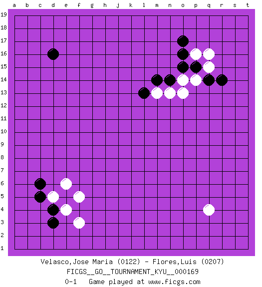 Last move : 0-1 2016 October 4 23:25:42 [Event "FICGS__GO__TOURNAMENT_KYU__000169 "] [Site "FICGS"] [Date "2016.09.01"] [Round "1"] [Black "Velasco,Jose Maria "] [White "Flores,Luis "] [Result "0-1"] [Rating 1 "0122"] [Rating 2 "0207"] 1.d4 q4 2.d16 q16 3.o17 f3 4.c6 e4 5.d3 f5 6.r14 d5 7.c5 e6 8.p15 p16 9.o16 q15 10.q14 p14 11.o15 o14 12.n14 n13 13.m14 m13 14.l13 o13 0-1 Here are the names of the openings (joseki) played in the four corners : Corner q16 : q16 o17Hoshi (Hwajeom, Seongjeom, Xingwei`) 4-4 Point. The star or hoshi (4-4) point, emphasizing influence at the potential expense of territory.Ikken Kakari (Hankan Keolch'im, Yi Gua`jiao~, 1-Space Low Approach). Black 2 is the standard approach move to the 4-4. Corner d4 : d4 f3Hoshi (Hwajeom, Seongjeom, Xingwei`) 4-4 Point. The star or hoshi (4-4) point, emphasizing influence at the potential expense of territory.Ikken Kakari (Hankan Keolch'im, Yi Gua`jiao~, 1-Space Low Approach). White 2 is the standard approach move to the 4-4. Corner q4 : q4 0-1Hoshi (Hwajeom, Seongjeom, Xingwei`) 4-4 Point. The star or hoshi (4-4) point, emphasizing influence at the potential expense of territory. Player White won this Go (weiqi, baduk) game.Follow this game move after move (download ) Five liberties for tactical stability. (Anonymous) He is a liar. I just don't know what the lie is yet. (Horatio Caine, C.S.I. Miami)