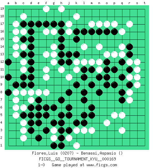 Last move : 1-0 2016 October 14 12:21:12 [Event "FICGS__GO__TOURNAMENT_KYU__000169"] [Site "FICGS"] [Date "2016.09.01"] [Round "1"] [Black "Flores,Luis"] [White "Benassi,Aspasio"] [Result "1-0"] [Rating 1 "0207"] 1.d16 q16 2.d4 q5 3.k16 r8 4.d10 f16 5.e17 q3 6.o16 q14 7.f17 c14 8.c15 b15 9.d15 b17 10.d17 g16 11.g17 g14 12.h17 b13 13.d14 c18 14.d13 r10 15.c13 b14 16.h16 f4 17.e5 c6 18.d6 k3 19.k4 l3 20.l4 p5 21.h15 f13 22.h12 c12 23.d12 p17 24.d11 j4 25.j5 o4 26.h5 k5 27.l5 l6 28.m5 k6 29.j6 k8 30.j3 h4 31.h3 g3 32.g4 g5 33.h4 m3 34.m6 j7 35.g6 c3 36.f5 c4 37.f3 g2 38.e4 e3 39.d3 f8 40.e2 j10 41.h7 n9 42.l7 k11 43.j8 k7 44.k9 h11 45.j12 k12 46.l8 f11 47.j13 c11 48.c10 f10 49.h14 c2 50.m9 n11 51.l10 o17 52.p16 l14 53.k13 m17 54.n16 n14 55.m16 n17 56.l16 g13 57.m11 m12 58.n10 o10 59.o11 n12 60.o9 m10 61.l11 l12 62.n10 p10 63.n8 k18 64.p11 f19 65.q10 c8 66.p9 d7 67.e7 e8 68.f6 r17 69.d9 r12 70.q12 g12 71.h13 j2 72.h2 k1 73.h1 q13 74.r11 d8 75.c9 s11 76.o10 s10 77.q8 r7 78.r9 s9 79.g1 p13 80.r13 s12 81.r14 b8 82.b9 a9 83.a10 c16 84.c17 b16 85.o12 o13 86.c5 b5 87.q7 d5 88.e6 h19 89.c5 b6 90.d5 b7 91.a12 j17 92.a8 j16 93.k15 1-0 Here are the names of the openings (joseki) played in the four corners : Corner d16 : d16 f16 Hoshi (Hwajeom, Seongjeom, Xingwei`) 4-4 Point. The star or hoshi (4-4) point, emphasizing influence at the potential expense of territory. Ikken Takagakari (Hankan Nop'dakeolch'im, Yi Gaojia, 1-Space High Approach). Black typically responds at 6-4 or 3-10. Black 4-10 is played when Black finds play on the right side advantageous. Black 4-8 or 3-8 may be played when Black has support at top. Corner q16 : q16 o16 Hoshi (Hwajeom, Seongjeom, Xingwei`) 4-4 Point. The star or hoshi (4-4) point, emphasizing influence at the potential expense of territory. Ikken Takagakari (Hankan Nop'dakeolch'im, Yi Gaojia, 1-Space High Approach). White typically responds at 6-4 or 3-10. White 4-10 is played when White finds play on the right side advantageous. White 4-8 or 3-8 may be played when White has support at top. Corner d4 : d4 f4 Hoshi (Hwajeom, Seongjeom, Xingwei`) 4-4 Point. The star or hoshi (4-4) point, emphasizing influence at the potential expense of territory. Ikken Takagakari (Hankan Nop'dakeolch'im, Yi Gaojia, 1-Space High Approach). Black typically responds at 6-4 or 3-10. Black 4-10 is played when Black finds play on the right side advantageous. Black 4-8 or 3-8 may be played when Black has support at top. Player Black won this Go (weiqi, baduk) game. Follow this game move after move (download)Attach to the strongest stone in a pincer. (Anonymous) Either move or be moved. (Ezra Pound)