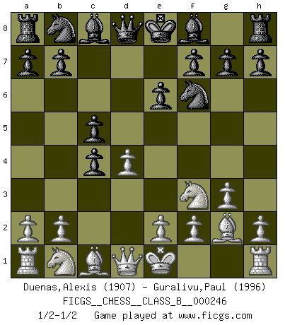 Last move : 1/2-1/2 2016 September 5 21:34:45 [Event "FICGS__CHESS__CLASS_B__000246"] [Site "FICGS"] [Date "2016.09.02"] [Round "1"] [White "Duenas,Alexis"] [Black "Guralivu,Paul"] [Result "1/2-1/2"] [WhiteElo "1907"] [BlackElo "1996"] 1.d4 Nf6 2.c4 e6 3.g3 d5 4.Nf3 dxc4 5.Bg2 c5 1/2-1/2 Catalan Opening This chess game ended in a draw. Follow this game move after move (download)If your opponent offers you a draw, try to work out why he thinks he's worse off. (Nigel Short) Als er Schachweltmeister wurde ließ er praktisch alle stärksten Sovietspieler für sich arbeiten. Wenn ein auch nur mittelmässiger Meister ein Spezialist für eine bestimmte Eröffnung war, wurde er von Karpov gerufen. Das wurde alles geheim gehalten. (Mikhail Moiseyevich Botvinik) Aún el Rey más flojo huye despavorido ante la amenaza de un Jaque doble. (Aaron Nimzowitsch) A chaque perte on perd un peu de soi. (Joël Lautier) Don't be irreplaceable, if you can't be replaced, you can't be promoted. (Dan Rotaru)