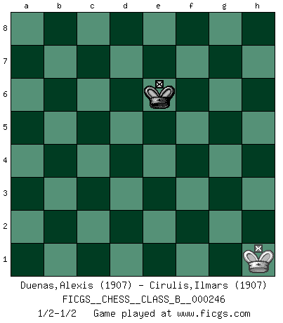 Last move : 1/2-1/2 2016 September 9 0:13:27 [Event "FICGS__CHESS__CLASS_B__000246"] [Site "FICGS"] [Date "2016.09.02"] [Round "1"] [White "Duenas,Alexis"] [Black "Cirulis,Ilmars"] [Result "1/2-1/2"] [WhiteElo "1907"] [BlackElo "1907"] 1.d4 a6 2.c4 e6 3.Bf4 Nf6 4.Nf3 d5 5.e3 c5 6.Nc3 dxc4 7.Bxc4 b5 8.Be2 Bb7 9.dxc5 Qxd1+ 10.Rxd1 Bxc5 11.O-O Nbd7 12.Rd2 Bb4 13.Rc2 h6 14.a3 Bxc3 15.Rxc3 Nd5 16.R3c1 Nxf4 17.exf4 Bd5 18.Ne5 Nb6 19.Rc7 O-O 20.Rfc1 Rac8 21.Kf1 Bc4 22.Rxc8 Rxc8 23.Nxc4 bxc4 24.g3 a5 25.Ke1 f5 26.h4 Kf7 27.Rc3 a4 28.Rc2 Ke7 29.Kd1 Kd6 30.Kc1 Kc5 31.Rd2 Kc6 32.h5 Rf8 33.Rc2 Kc5 34.Bd1 Ra8 35.Re2 Kd6 36.Re5 Nd5 37.Kc2 Rf8 38.Be2 Rc8 39.Bf3 Rf8 40.Be2 Rc8 41.Bf3 Rb8 42.Be2 Kc5 43.Rxe6 c3 44.bxc3 Rb3 45.c4 Nc3 46.Bd3 Rxa3 47.Re7 Ne4 48.Re5+ Kb6 49.Bxe4 fxe4 50.Kb2 Rb3+ 51.Ka2 Rf3 52.f5 Rxf2+ 53.Ka3 Rf3+ 54.Kxa4 Rxg3 55.Kb4 Rg5 56.Re6+ Kc7 57.Rxe4 Rxf5 58.Re7+ Kd6 59.Rxg7 Rxh5 60.c5+ Rxc5 61.Rd7+ Kxd7 62.Kxc5 h5 63.Kd5 h4 64.Ke4 h3 65.Kf3 h2 66.Kg2 h1Q+ 67.Kxh1 Ke6 1/2-1/2 Queen's pawn Kingside Castling by player White (move 11) Kingside Castling by player Black (move 19) 10 pieces endgame at move 54 : White KRPPP , Black KRPPP WHITE : King + 1 Rook 3 Pawns BLACK : King + 1 Rook 3 Pawns 9 pieces endgame at move 57 : White KRPPP , Black KRPP WHITE : King + 1 Rook 3 Pawns BLACK : King + 1 Rook 2 Pawns 8 pieces endgame at move 57 : White KRPP , Black KRPP WHITE : King + 1 Rook 2 Pawns BLACK : King + 1 Rook 2 Pawns 7 pieces endgame at move 59 : White KRPP , Black KRP WHITE : King + 1 Rook 2 Pawns BLACK : King + 1 Rook 1 Pawn 6 pieces endgame at move 59 : White KRP , Black KRP WHITE : King + 1 Rook 1 Pawn BLACK : King + 1 Rook 1 Pawn 5 pieces endgame at move 60 : White KR , Black KRP WHITE : King + 1 Rook BLACK : King + 1 Rook 1 Pawn 4 pieces endgame at move 61 : White K , Black KRP WHITE : King + BLACK : King + 1 Rook 1 Pawn 3 pieces endgame at move 62 : White K , Black KP WHITE : King + BLACK : King + 1 Pawn Promotion Queen by player Black (move 66) 2 pieces endgame at move 67 : White K , Black K WHITE : King + BLACK : King + This chess game ended in a draw. Follow this game move after move (download)No one ever won a game by resigning. (Unknown) Garry Kasparov war erst in der Großmeister-Organisation GMA, dann in der Profischach-Vereinigung PCA, zum Schluss kehrte er wieder in den Schoß der FIDE zurück. Aber gut, manche Leute sind flexibel (Viswanathan Anand) El Ajedrez es un terrible juego. Si no controlas el centro, tu oponente tiene una posición mas holgada. Si tienes control del centro, ¡entonces realmente tu tienes algo de que preocuparte!. (Siegbert Tarrasch) Je ne suis pas le dernier à jouer lâchement des coups douteux pendant le zeïtnot de l'adversaire pour l'achever: en effet les coups qui font le plus peur sont ceux que l'on ne comprend pas. Je me fais souvent peur quand je joue. (Un professeur anonyme) Your best chance to get a Royal Flush in a casino is in the bathroom. (Anonymous)