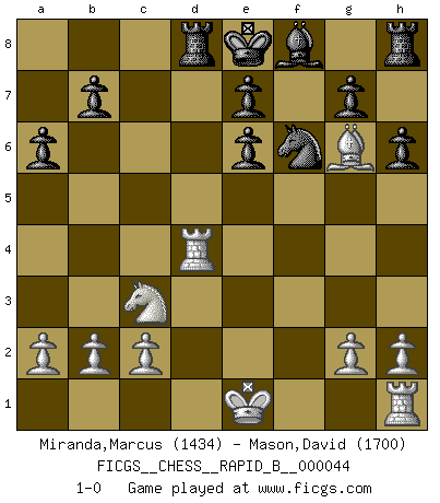 Last move : 1-0 2007 April 12 11:54:48 [Event "FICGS__CHESS__RAPID_B__000044"] [Site "FICGS"] [Date "2007.03.27"] [Round "1"] [White "Miranda,Marcus"] [Black "Mason,David"] [Result "1-0"] [WhiteElo "1434"] [BlackElo "1700"] 1.e4 c5 2.Nf3 d6 3.d4 cxd4 4.Nxd4 Nf6 5.Nc3 a6 6.Bg5 Nbd7 7.f4 h6 8.Bxf6 Nxf6 9.e5 dxe5 10.fxe5 Ng4 11.e6 Bxe6 12.Nxe6 Qxd1+ 13.Rxd1 fxe6 14.Rd4 Nf6 15.Bd3 Rd8 16.Bg6+ 1-0 Sicilian : Najdorf, 6.Bg5 Player White won this chess game. Follow this game move after move (download)That's what Chess is all about. One day you give your opponent a lesson, the next day he gives you one. (Bobby Fischer) Schach ist ein schwarz-weisser Dschungel. (Garry Kasparov) Solo el jugador con la iniciativa tiene el derecho a atacar. (Wilhelm Steinitz) Les ravages du H expliquent la différence de niveau entre Tal et Thal [Abergel]. Art is the only way to run away without leaving home. (Twyla Tharp)